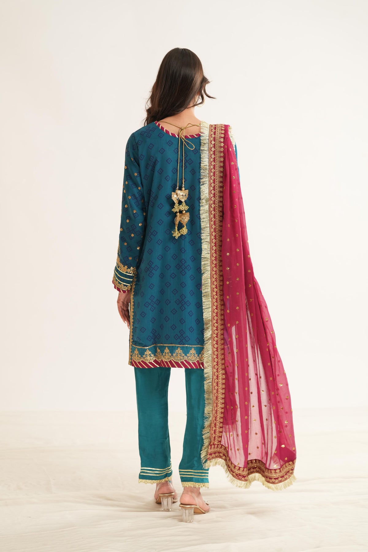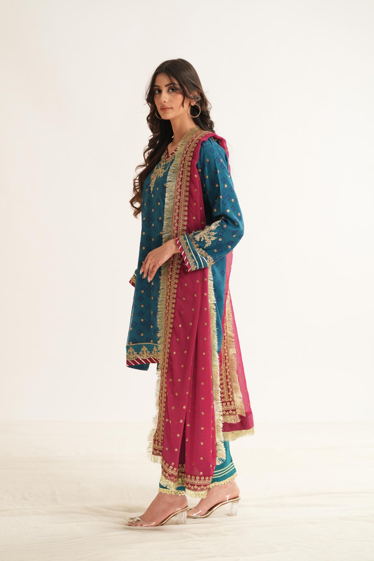 A zinc ensemble featuring a fully embroidered shirt with contrasting threadwork and detailing. Paired with wide-legged trouser with detailed border and a printed deep maroon chiffon dupatta adorned with accents. Ideal for festive occasions, this ensemble radiates sophistication.