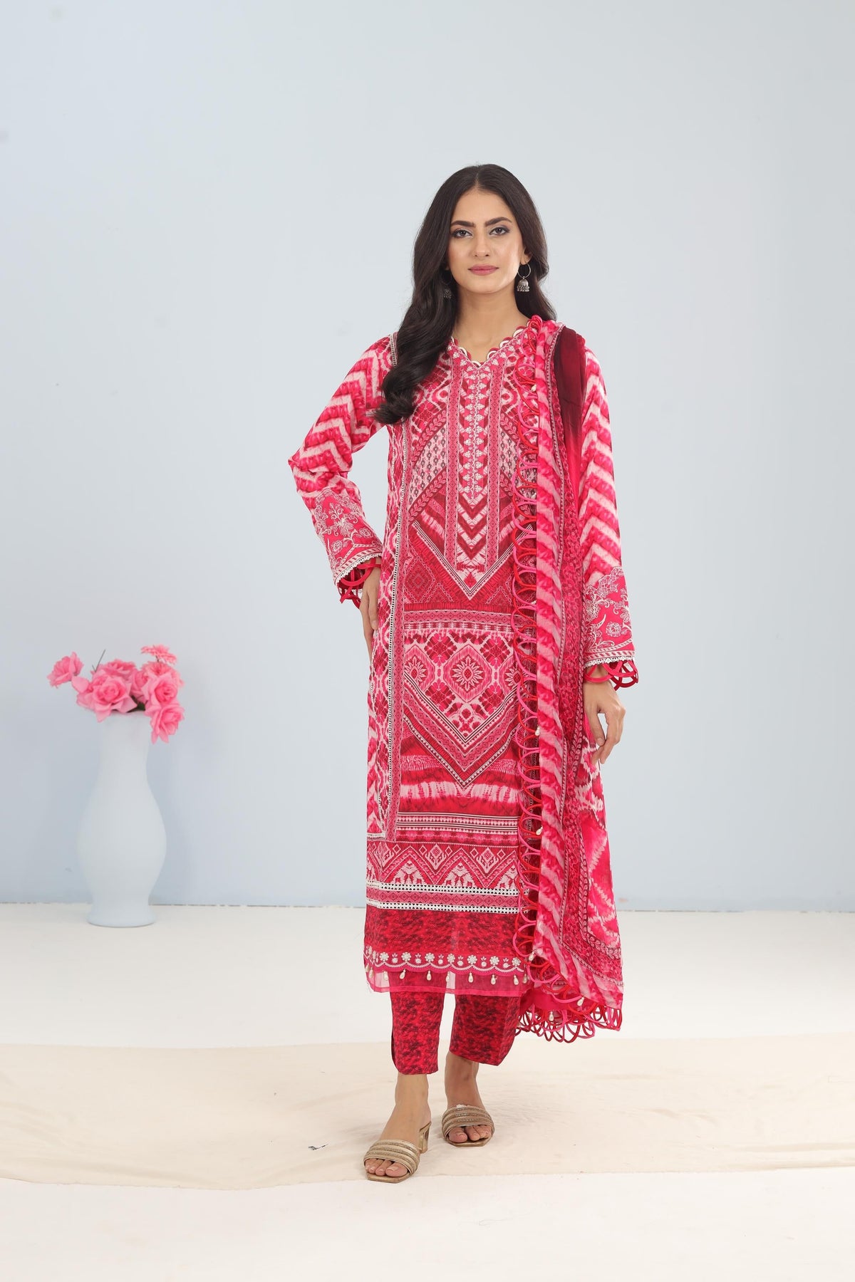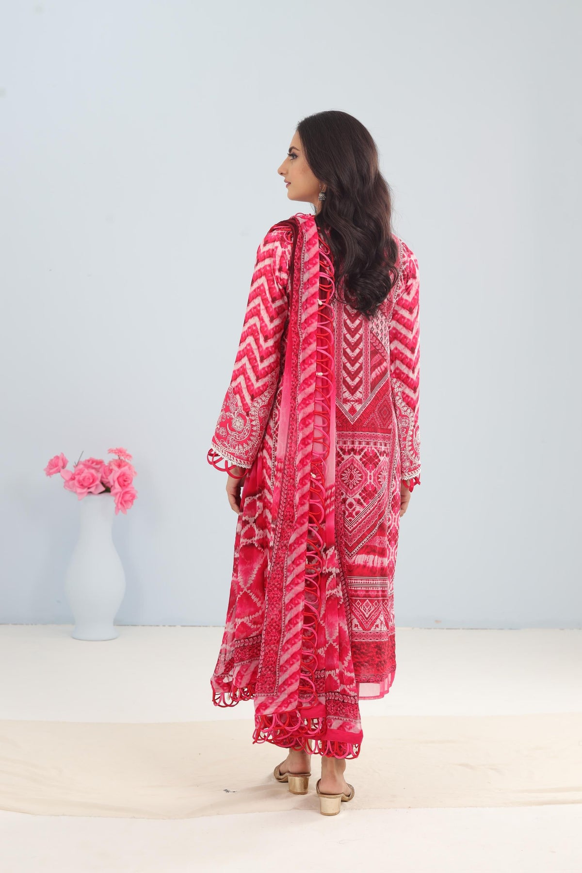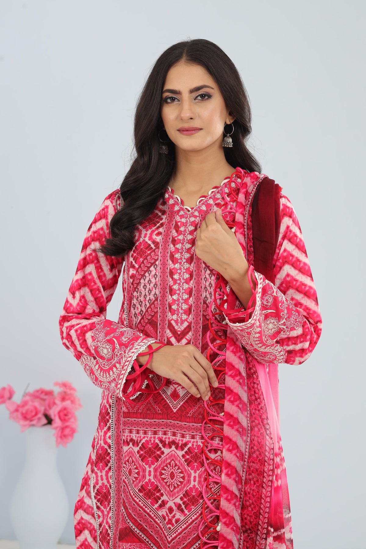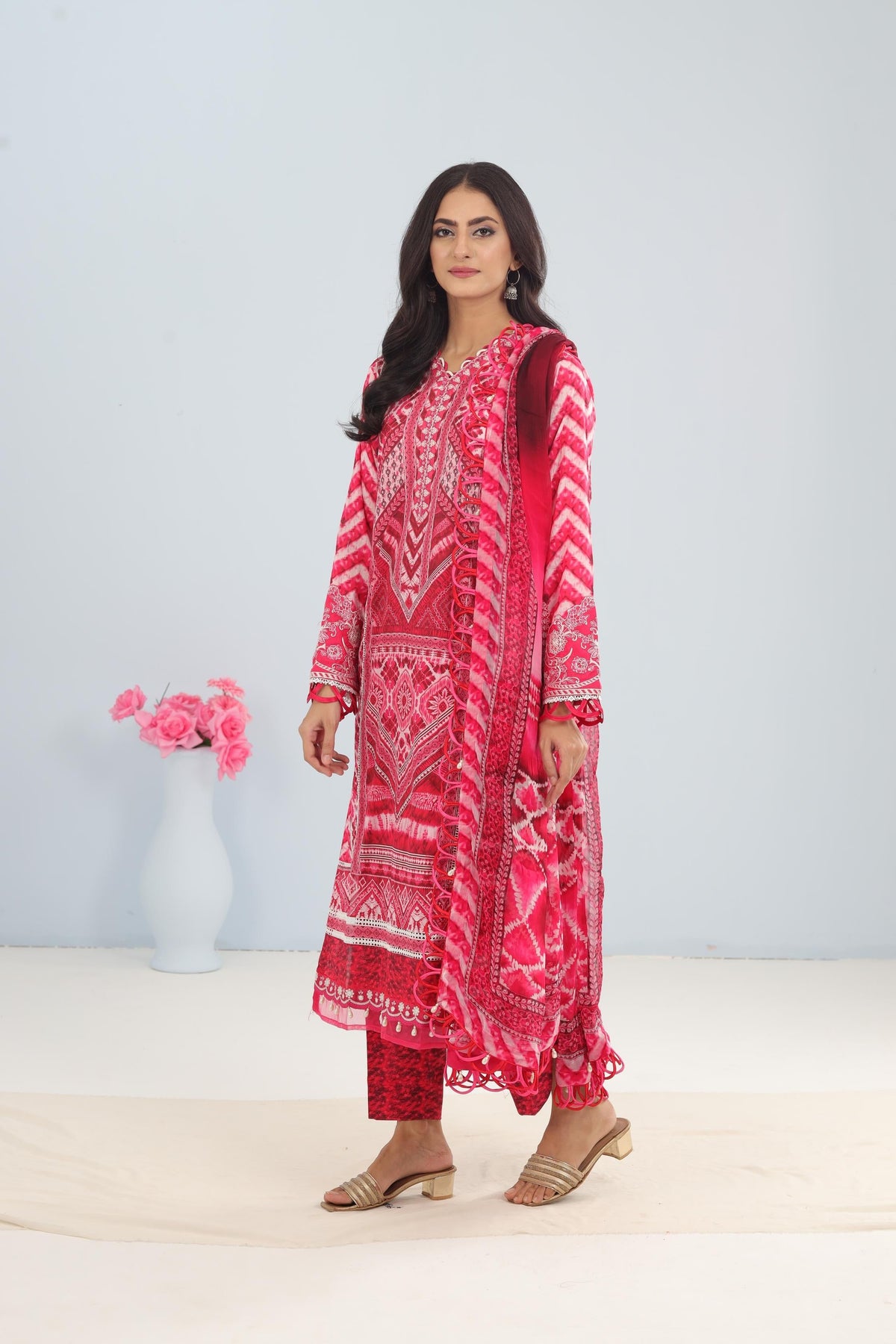 DescriptionShirtPrinted ShirtEmbroidered Organza Patti IEmbroidered Organza Patti IIEmbroidered Sleeves PatchColor: PinkFabric: LawnTrousersPrinted TrouserColor: PinkFabric: CambricDupattaPrinted DupattaColor: PinkFabric: Chiffon
