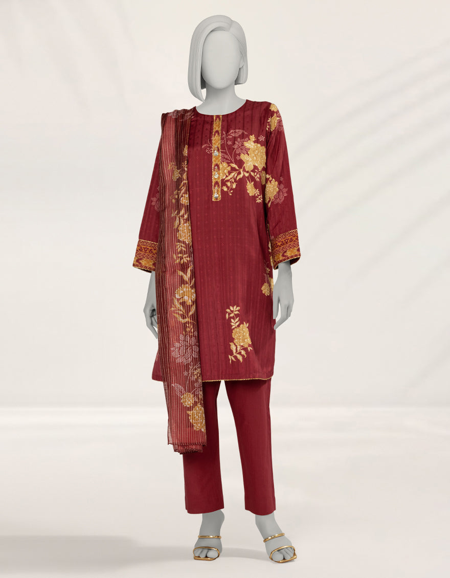 Jacquard Red Unstitched Suit - J. Junaid Jamshed