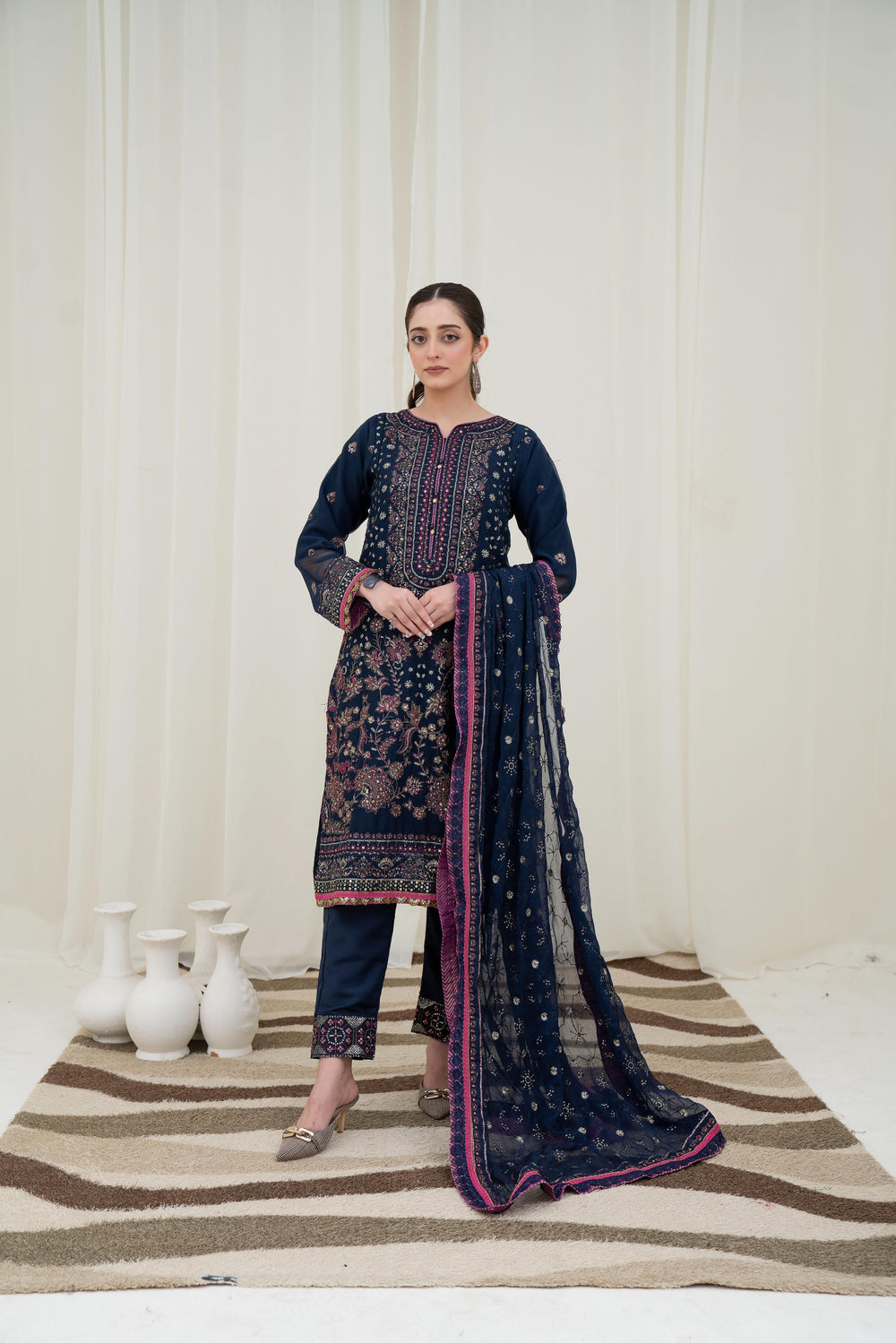Embroidered Chiffon Navy Blue Stitched Suit - Asim Jofa