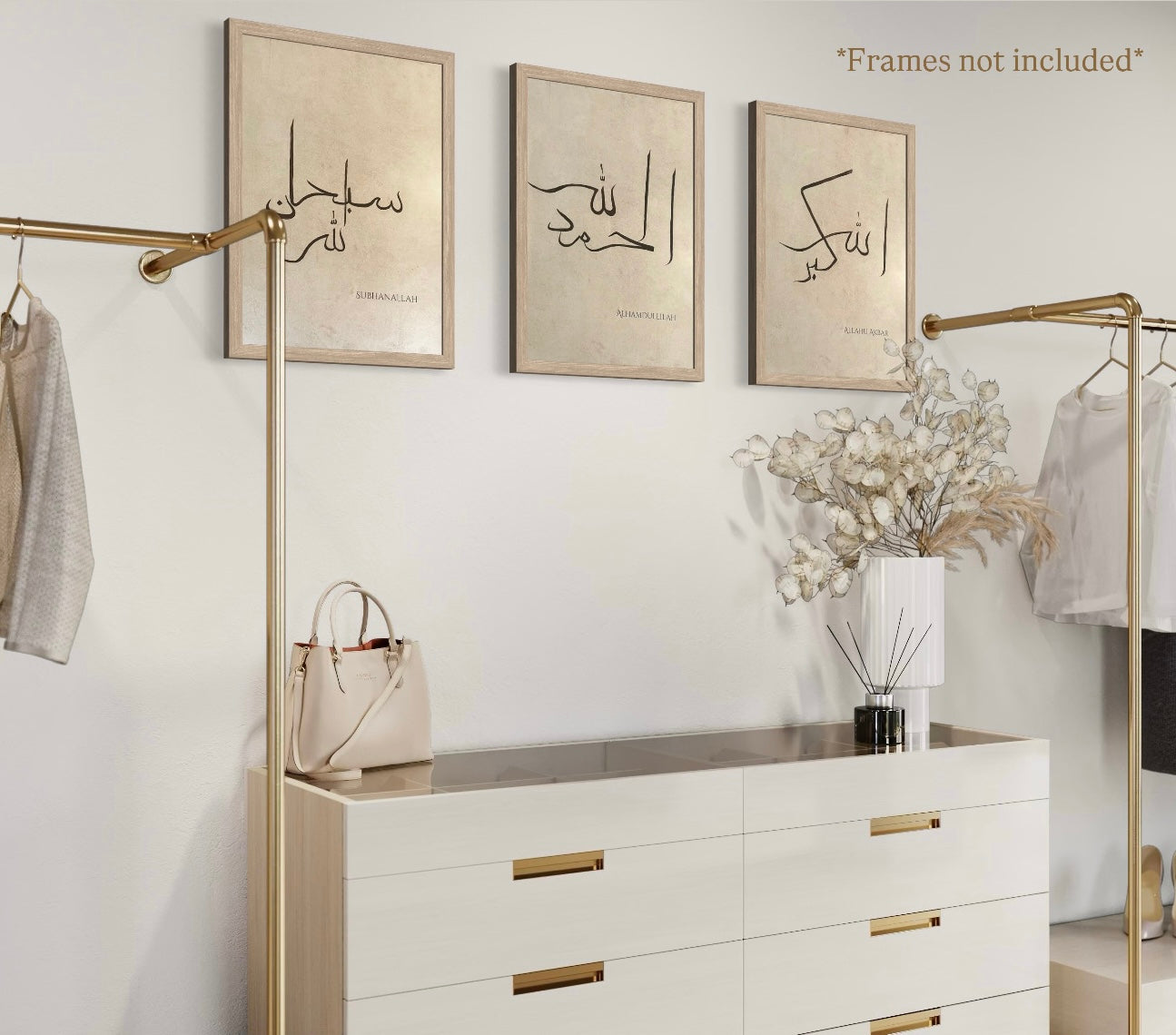 Set of 3 minimalist art prints, adding that perfect touch of character to any room, while reminding the viewer of three significant forms of Dhikr (short prayer); “Praise to Allah, Thank You Allah & Allah is The Greatest”. Soft neutral background with M Artistry’s Arabic calligraphy and english transcription. ***Frames not included***