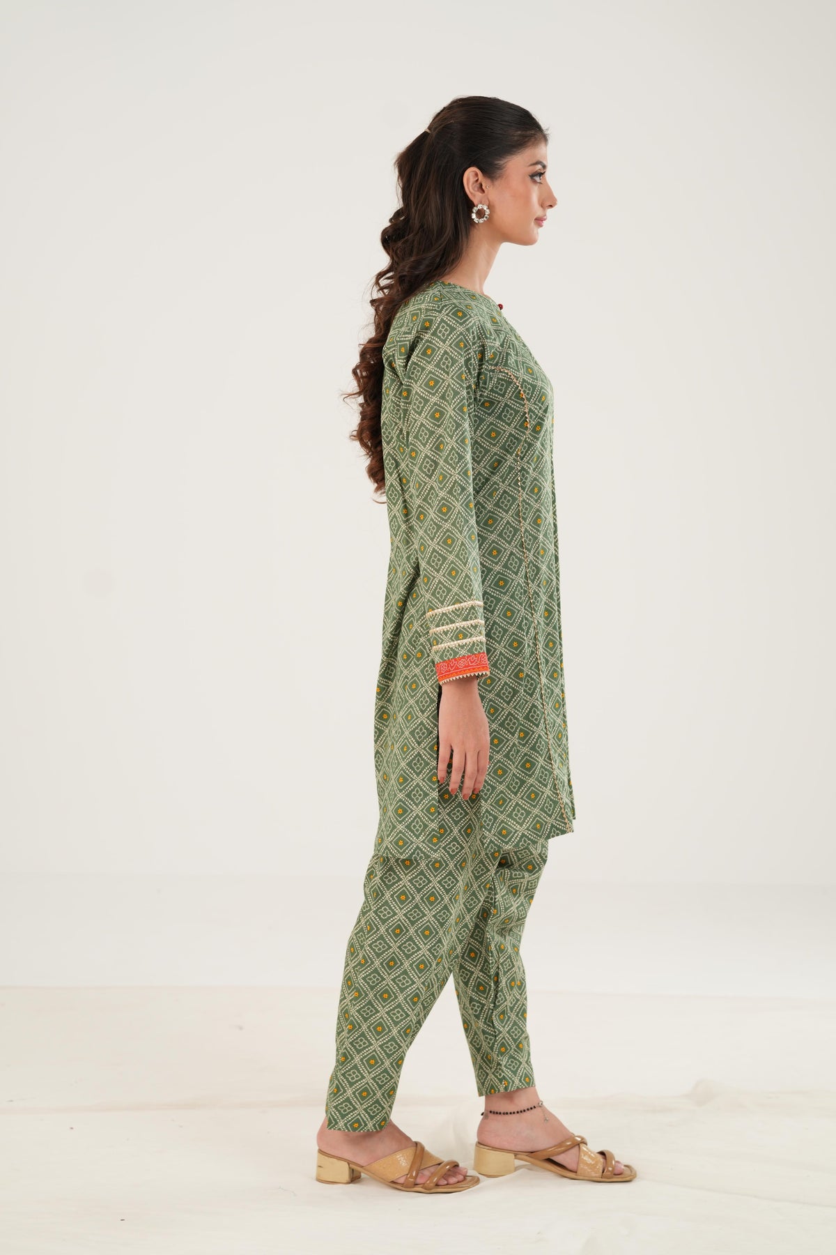 2 Piece Printed Lawn Shirt Shalwar in Green Color