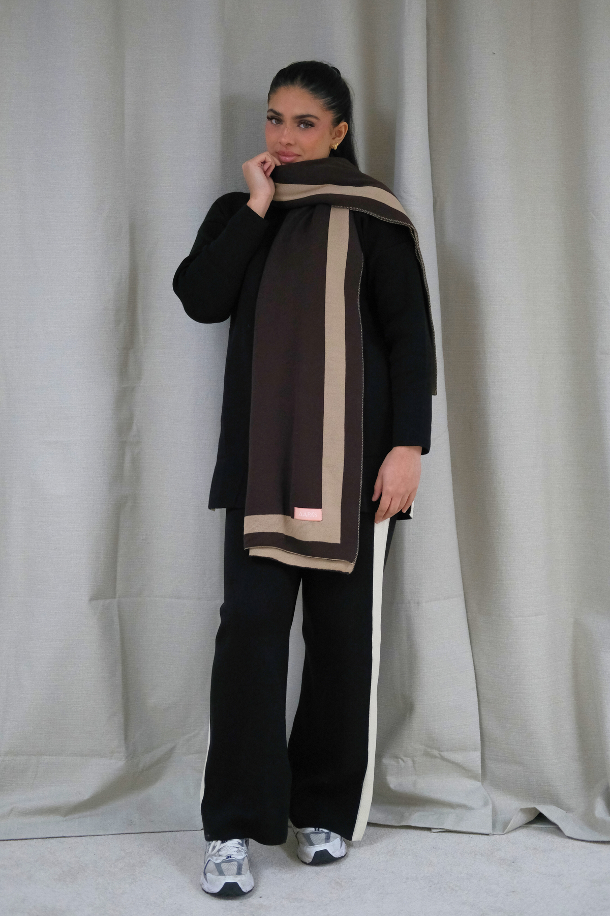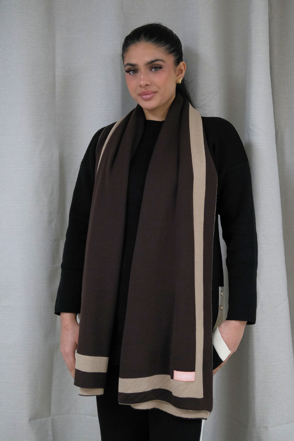 This knitted, softly draped shawl is finished with a contrast stripe border, offering a refined and timeless finish. Lightweight yet gently warming, its designed for effortless layering over knitwear or outerwear. Completed with the AAPAS logo label.