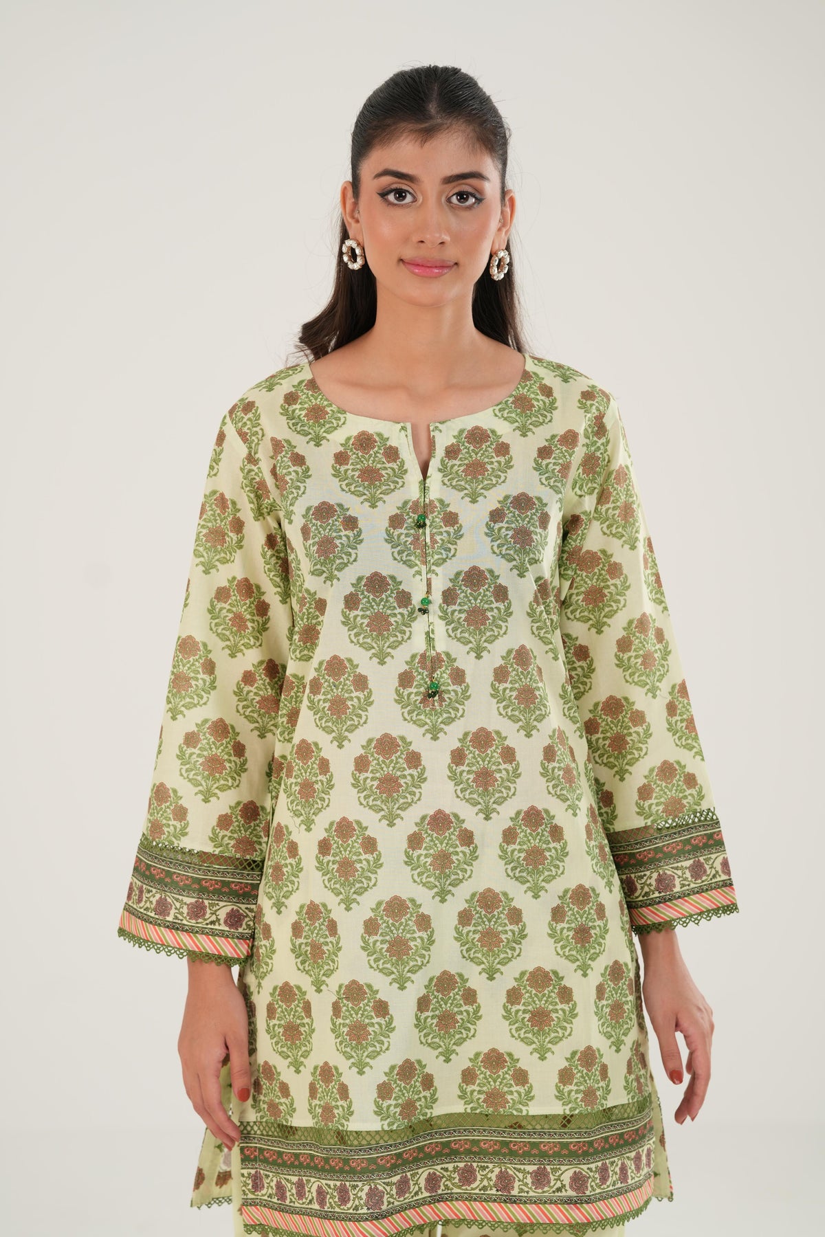 2 Piece Printed Lawn Shirt Shalwar in Beige Color