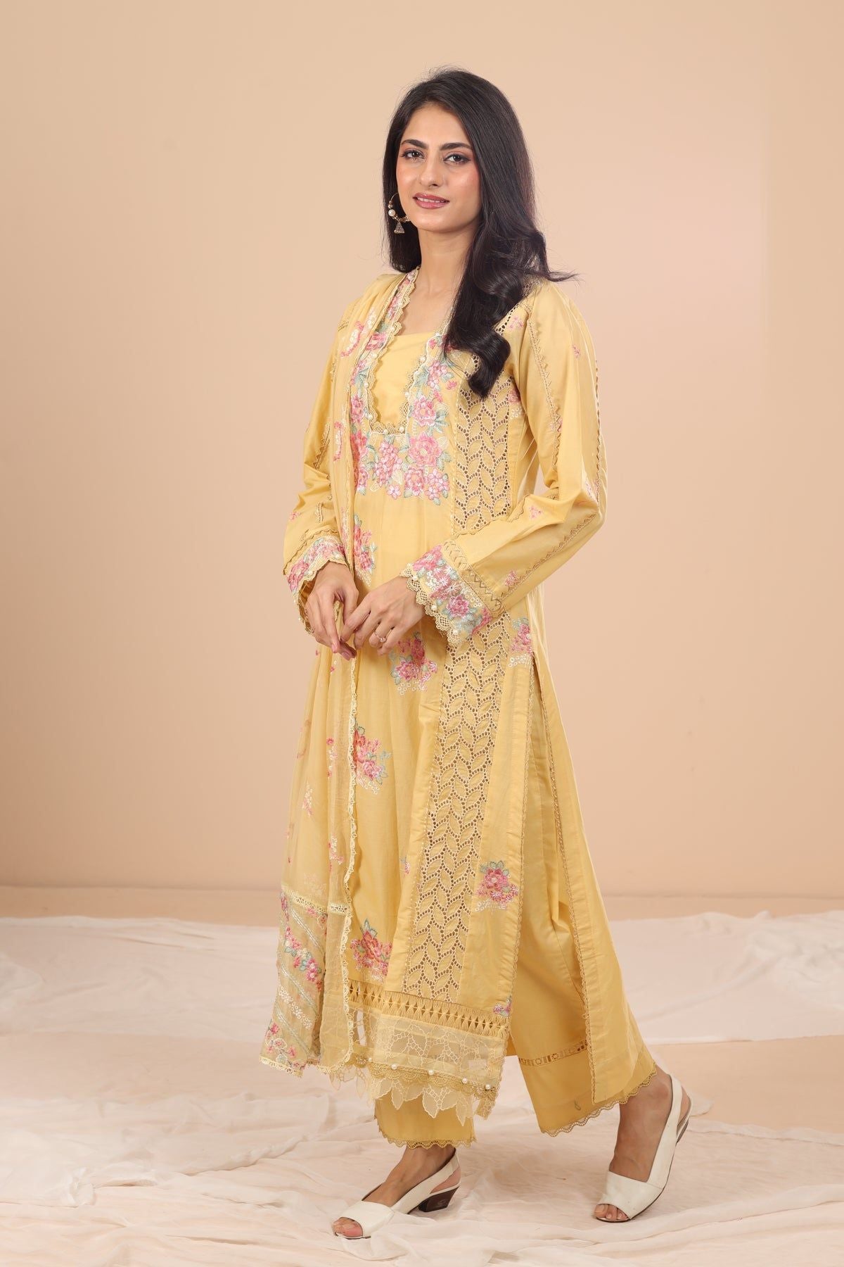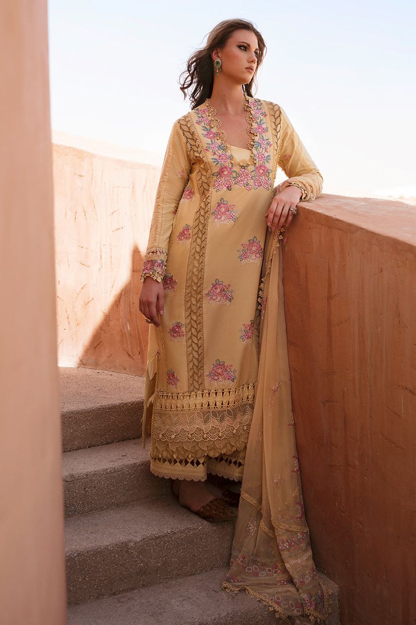 A picturesque portrayal of elegance, this fusion outfit showcases the beauty of mustard tones on a meticulously embroidered shirt with Parsi gara motifs - a delicate and stunning embroidery style originated in Persia featuring complex compositions depicted in bright and captivating colors. The flowing chiffon dupatta, highlighted with tasteful running embroidery, adds a touch of grace and finesse to the ensemble. Whether you're enjoying the warm summer breeze or attending a chic soiree, this impeccable outfit is sure to make heads turn.