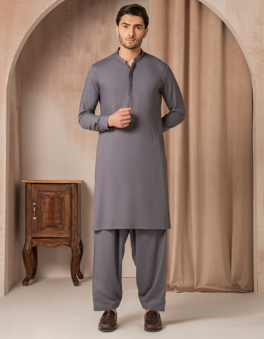 This grey blended semi-formal kameez shalwar offers a neat, stylish look that works well for family gatherings, dinners, or casual events. Easy to wear and effortlessly smart.