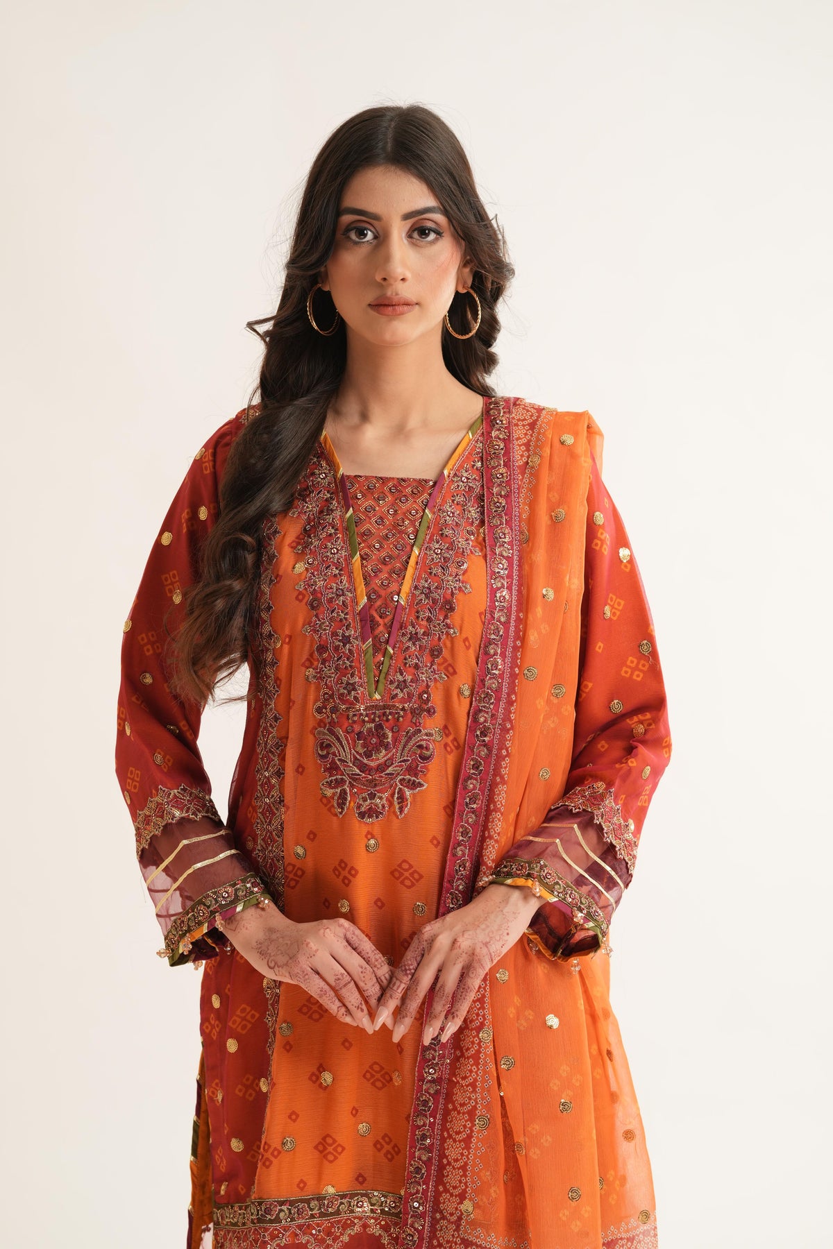 A deep orange ensemble featuring a fully embroidered shirt with contrasting threadwork and detailing. Paired with wide-legged trouser with detailed border and a printed chiffon dupatta adorned with accents. This look captures the essence of festive splendor and classic sophistication.