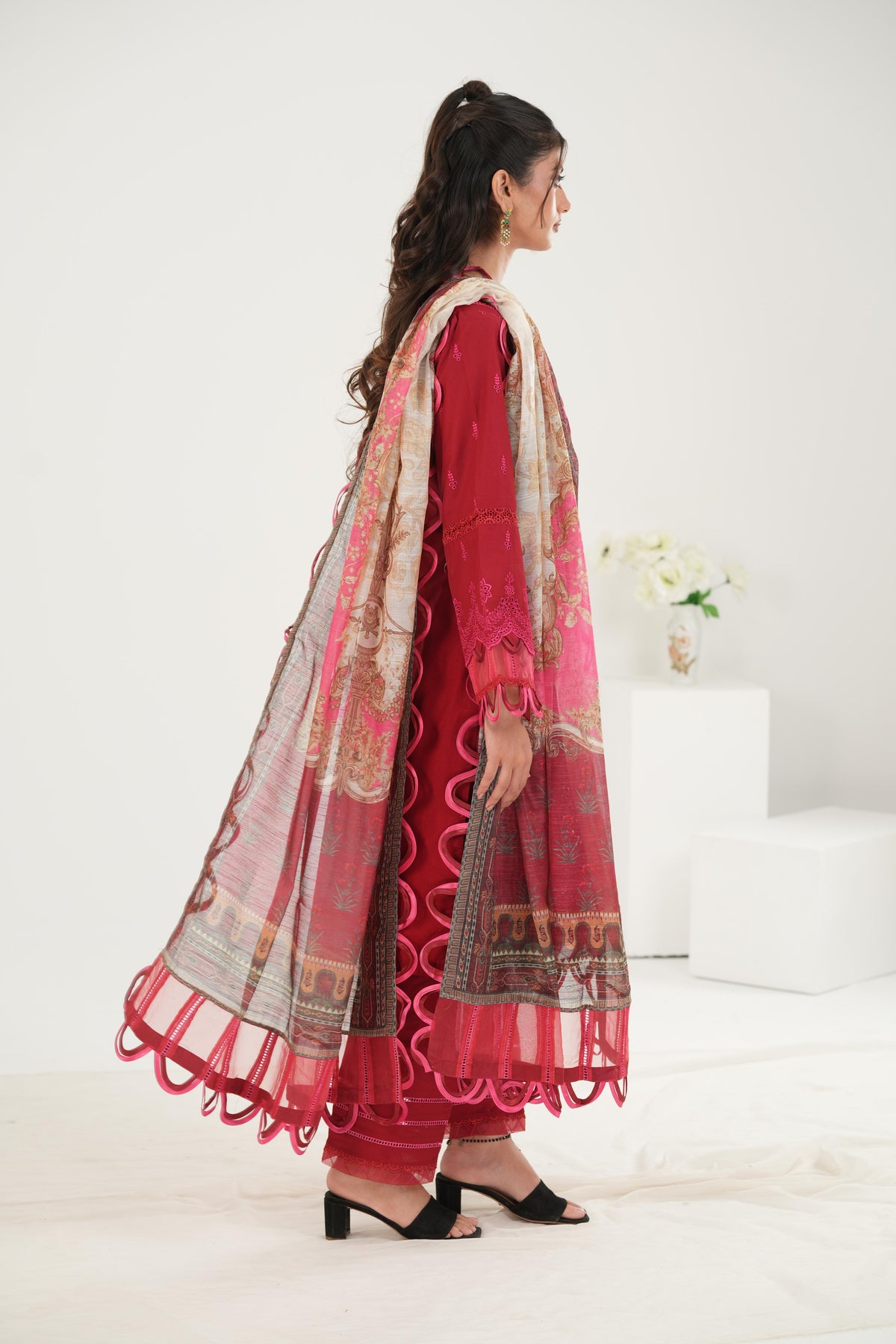 This elegant 3-piece set features a finely embroidered lawn shirt paired with a matching shalwar and dupatta in a vibrant red hue. Crafted with intricate Chikankari embroidery, it offers a blend of traditional artistry and contemporary style. Ideal for formal occasions, this ensemble ensures both comfort and sophistication, making it a distinguished addition to your wardrobe.