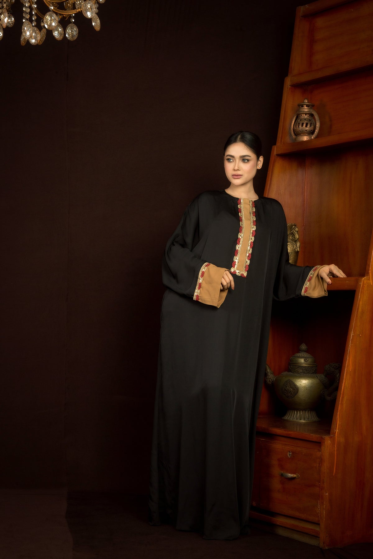 Effortlessly regal, the Raya Black Abaya is where tradition meets refined luxury. Tailored in a fluid silhouette, this abaya features gold-toned contrast cuffs and neckline, framed by intricate hand-style embroidery in ruby and champagne tones.