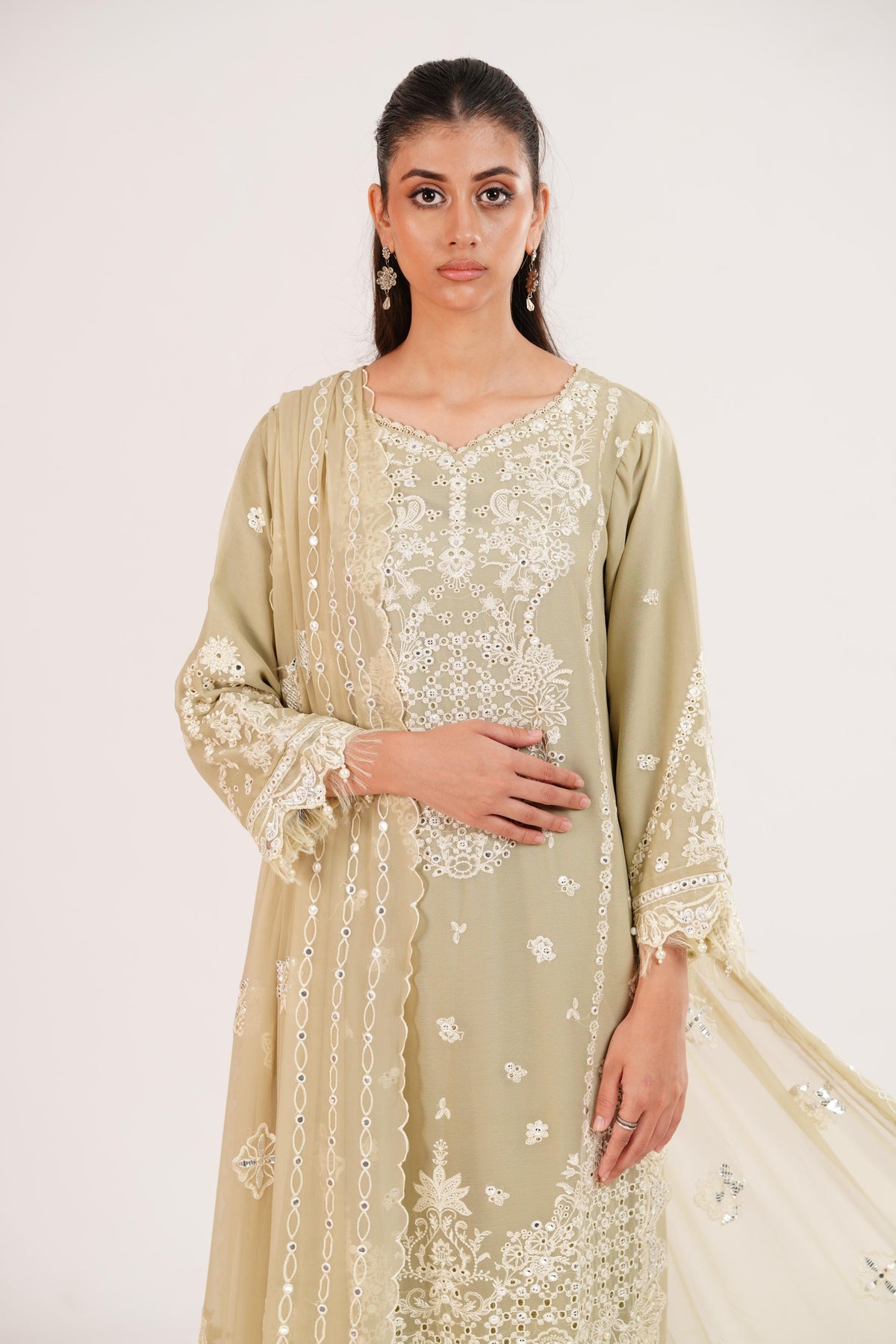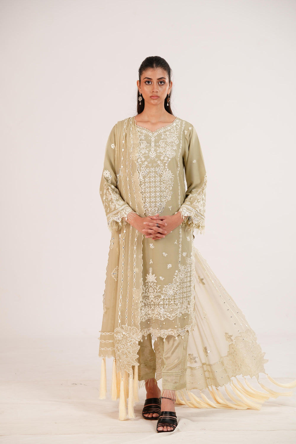 A mint green ensemble featuring delicate foil embroidery and detailed threadwork, paired with raw silk trousers and a beautifully embroidered chiffon dupatta, creating a perfect fusion of elegance and cultural grace.