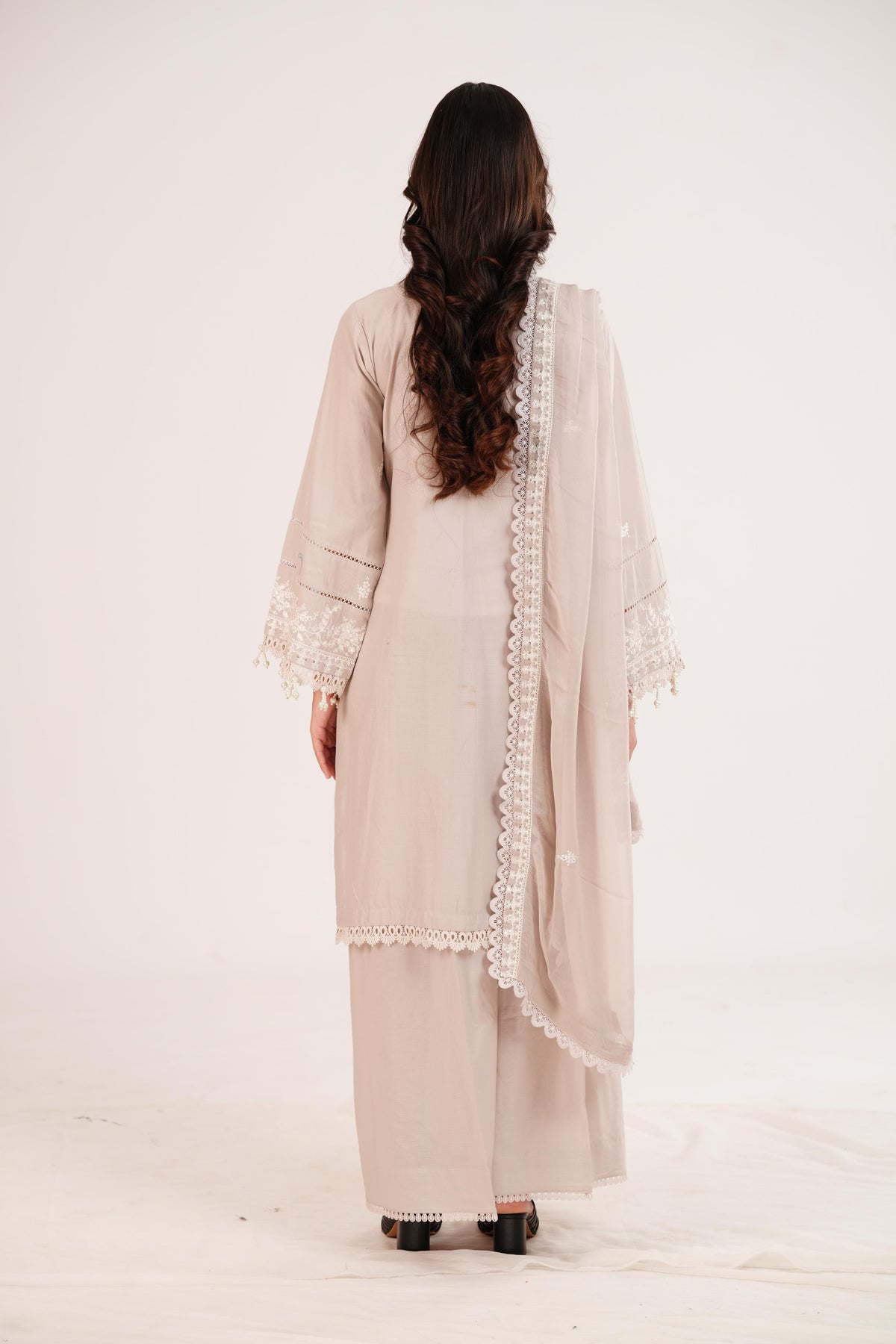 This elegant 3-piece lawn suit features a delicately embroidered lawn fabric on the front and sleeves, paired with a dyed back for a refined contrast. The cambric dyed trouser offers a comfortable and breathable fit, while the chiffon dupatta is beautifully embroidered to complete the ensemble with grace and sophistication. Ideal for those seeking a blend of traditional craftsmanship and contemporary style.