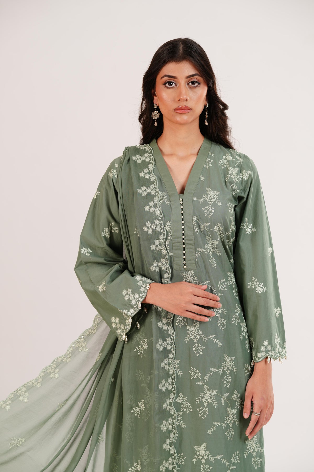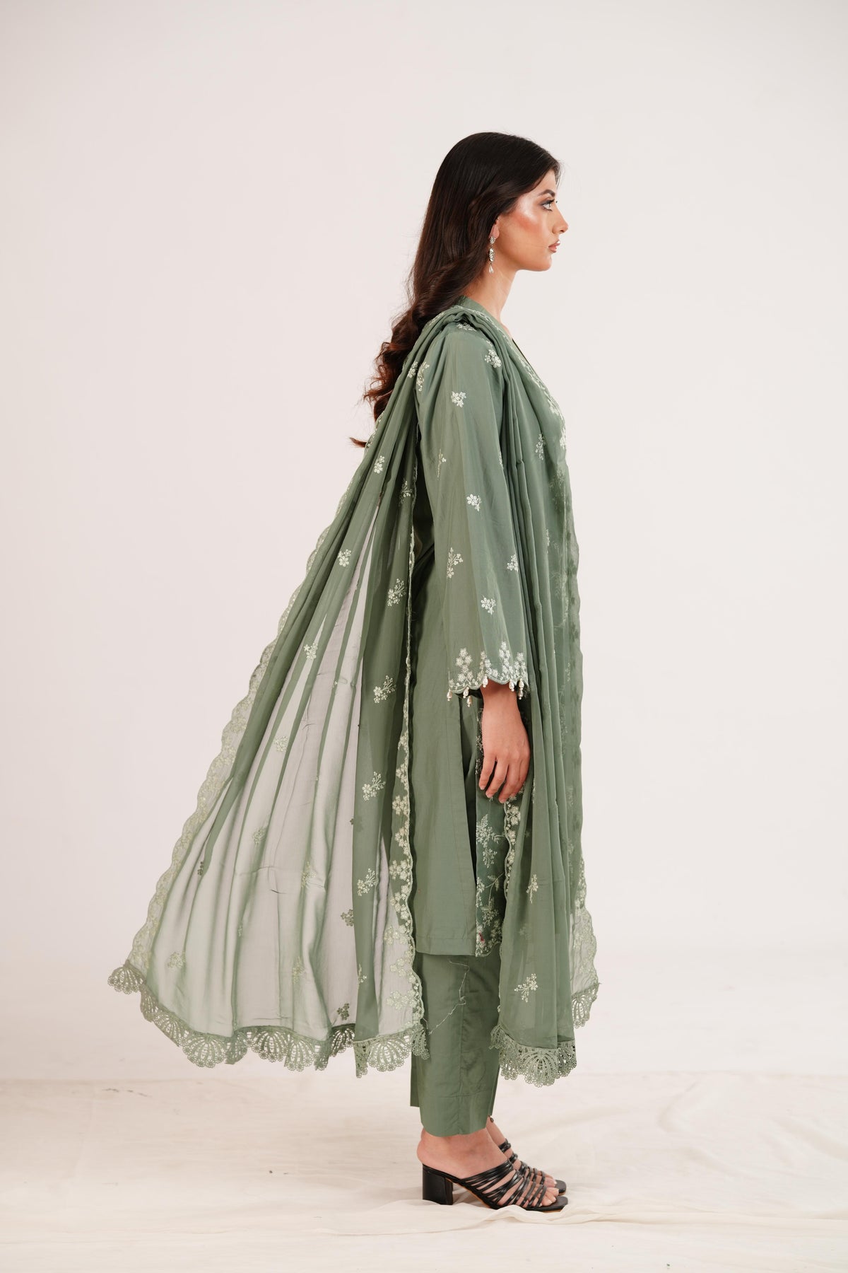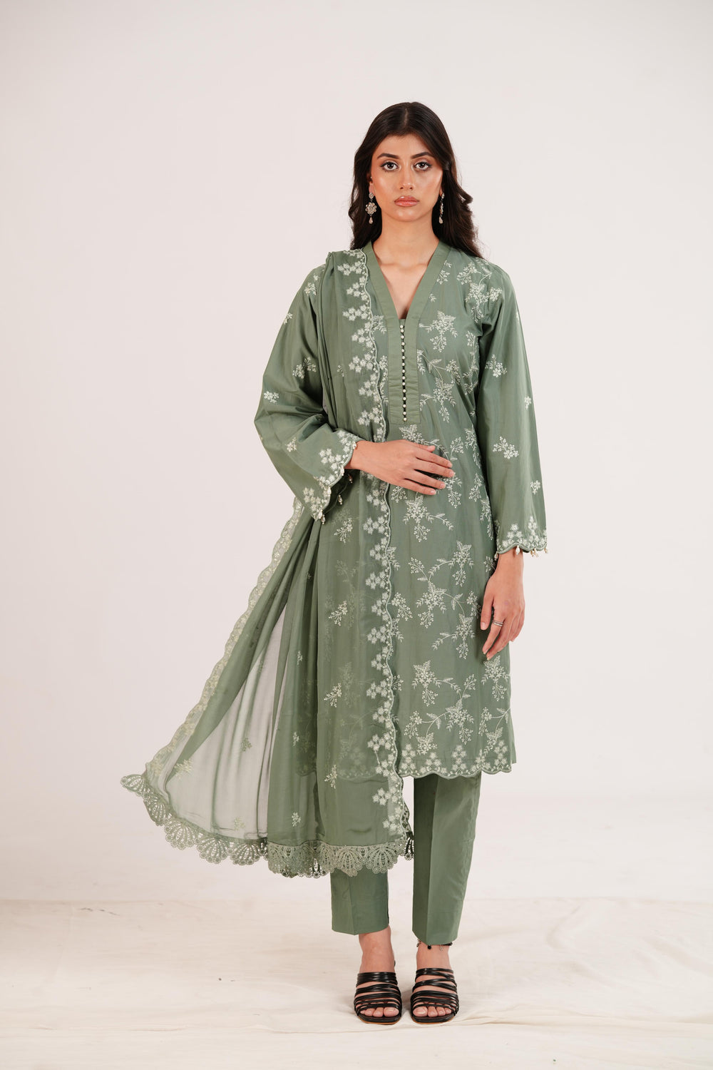 This Forest Serenity 3PC Lawn Embroidered Suit features a finely embroidered lawn fabric on the front and sleeves, paired with a dyed back for a balanced look. The cambric dyed trouser offers comfort and durability, while the chiffon dupatta is delicately embroidered to complement the ensemble. Ideal for those seeking a refined and elegant outfit with expert craftsmanship.