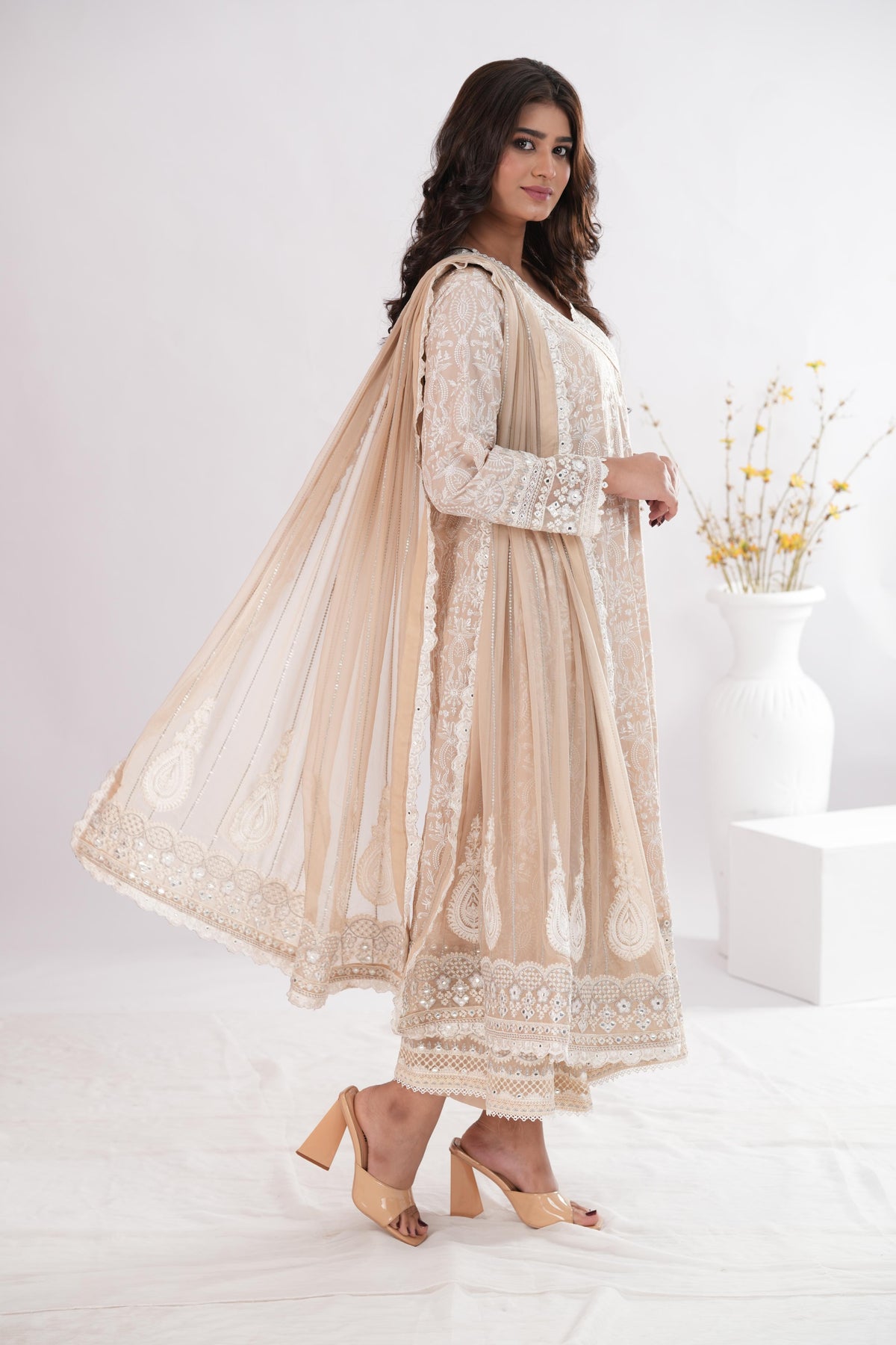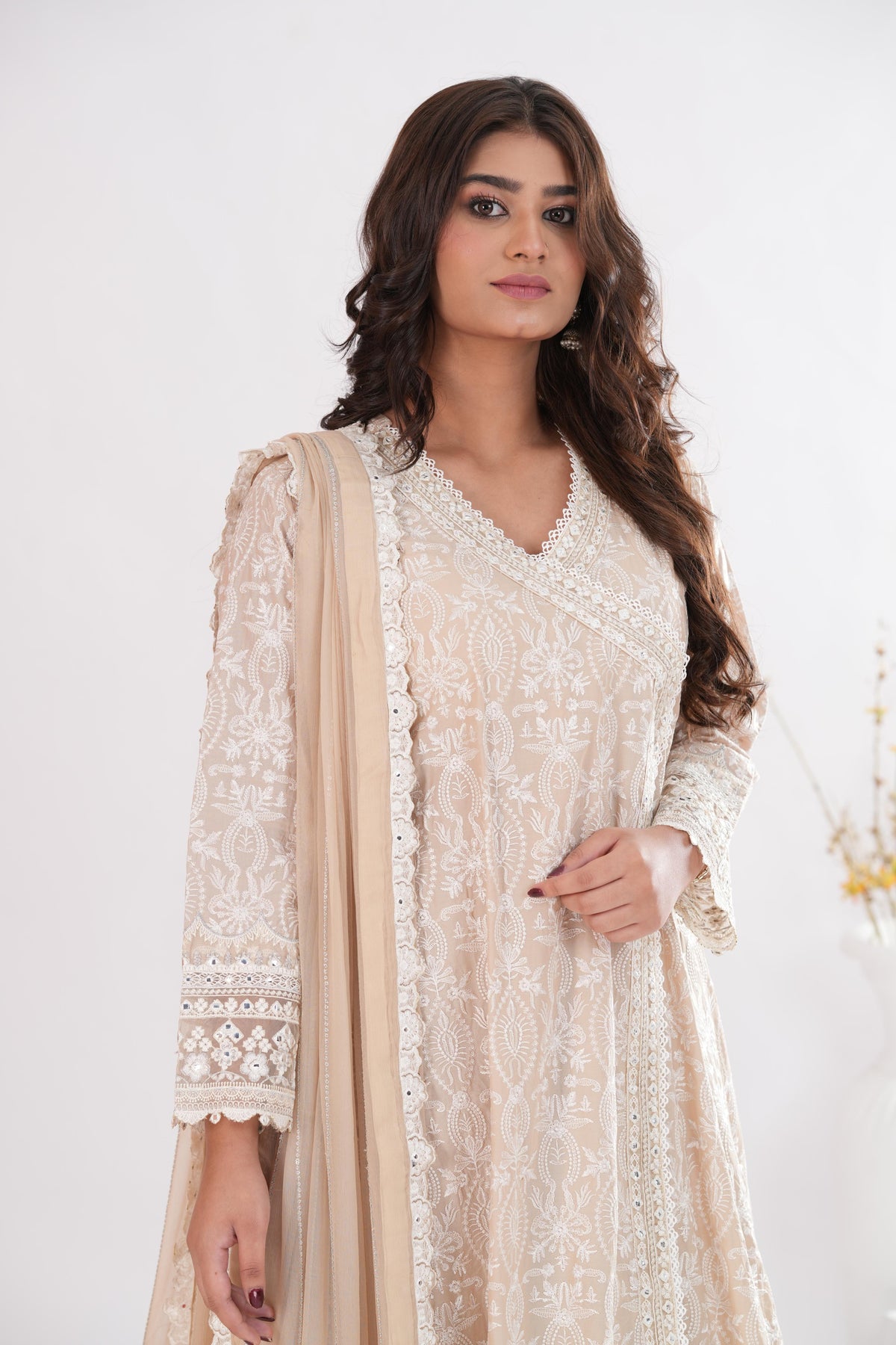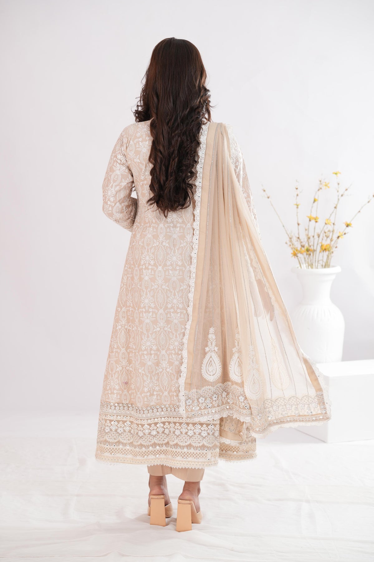 Bathed in a celestial glow, Ilima radiates an effortlessly sophisticated aura. Cut from a sumptuously soft lawn, this set brings forth brilliance of thread work with elaborate floral artworks spread over a four yards shirt piece. Paired with a plain lawn piece for trousers and an exquisitely embroidered chiffon dupatta, this set promises to elevate your classic, summer look.