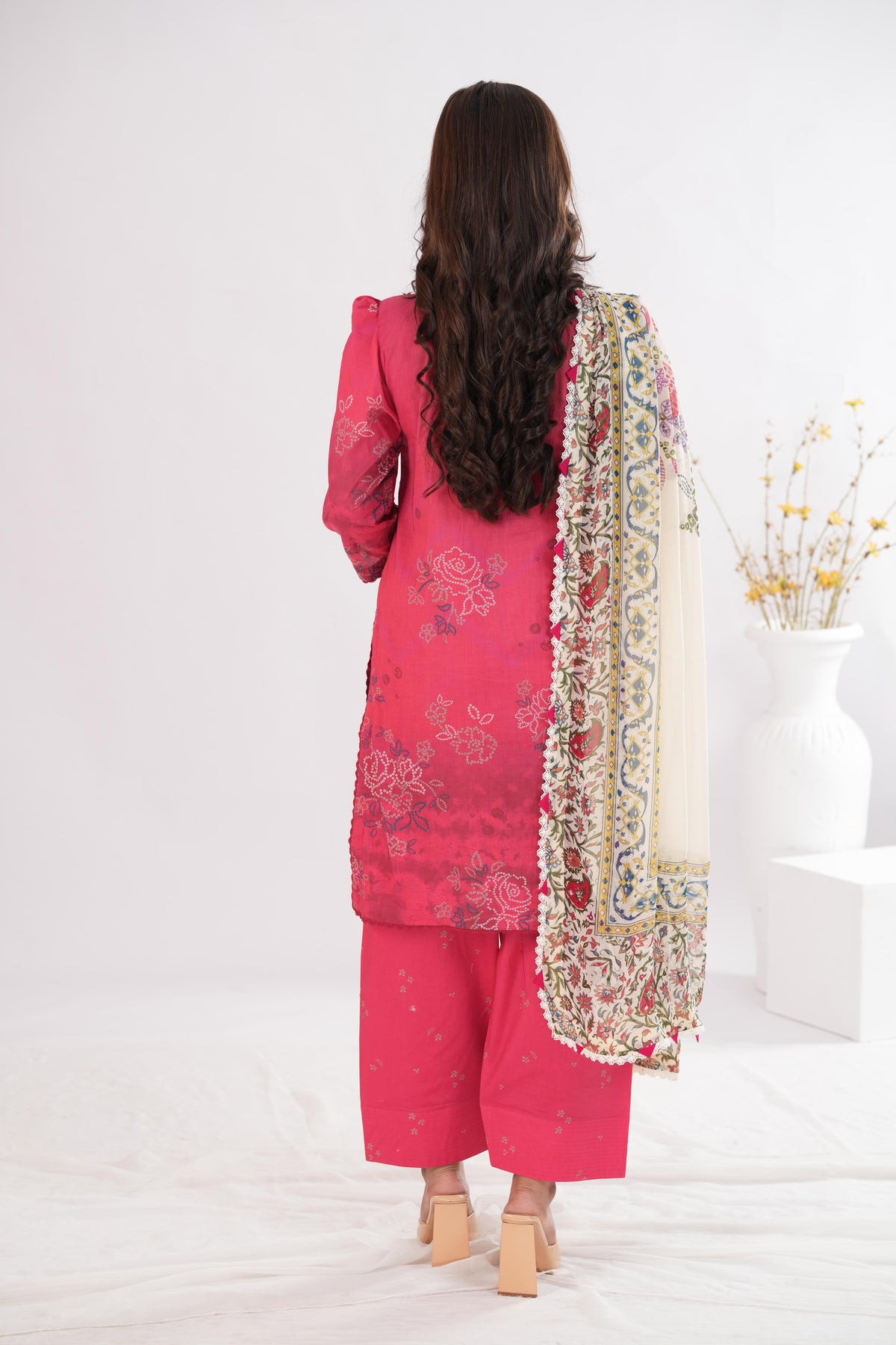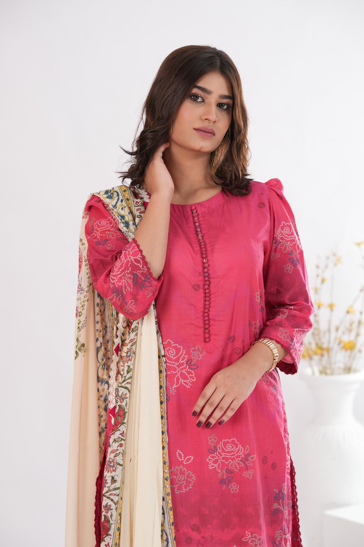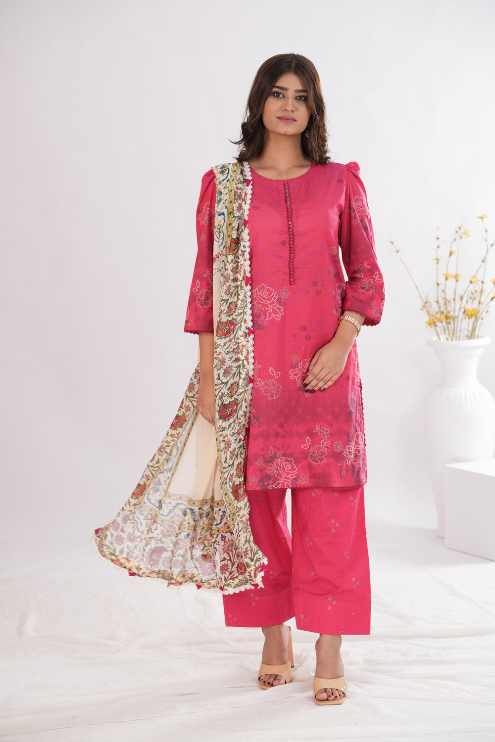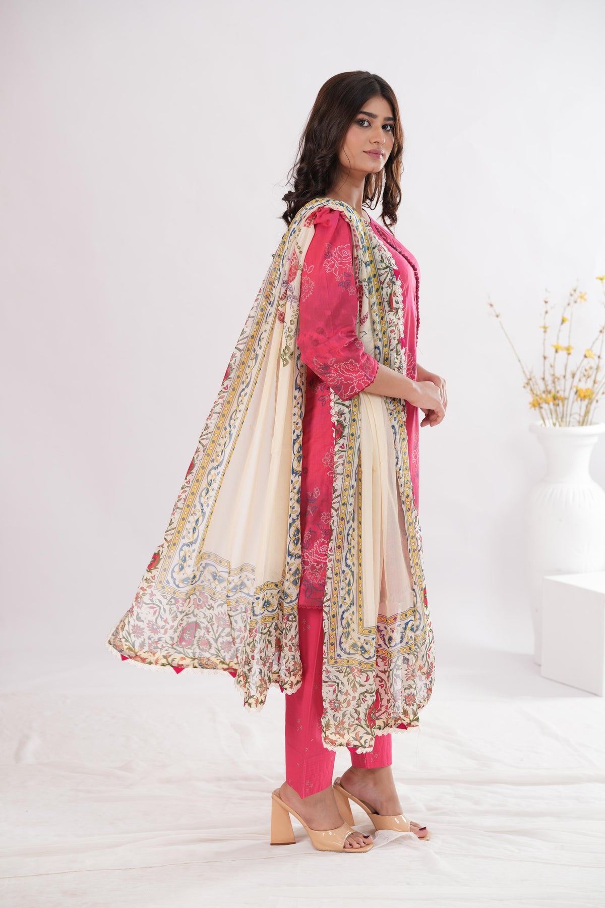 A hot pink ensemble with Bandhani-inspired detailing, paired with a breezy chiffon dupattaÑvibrant, playful, and rooted in tradition.