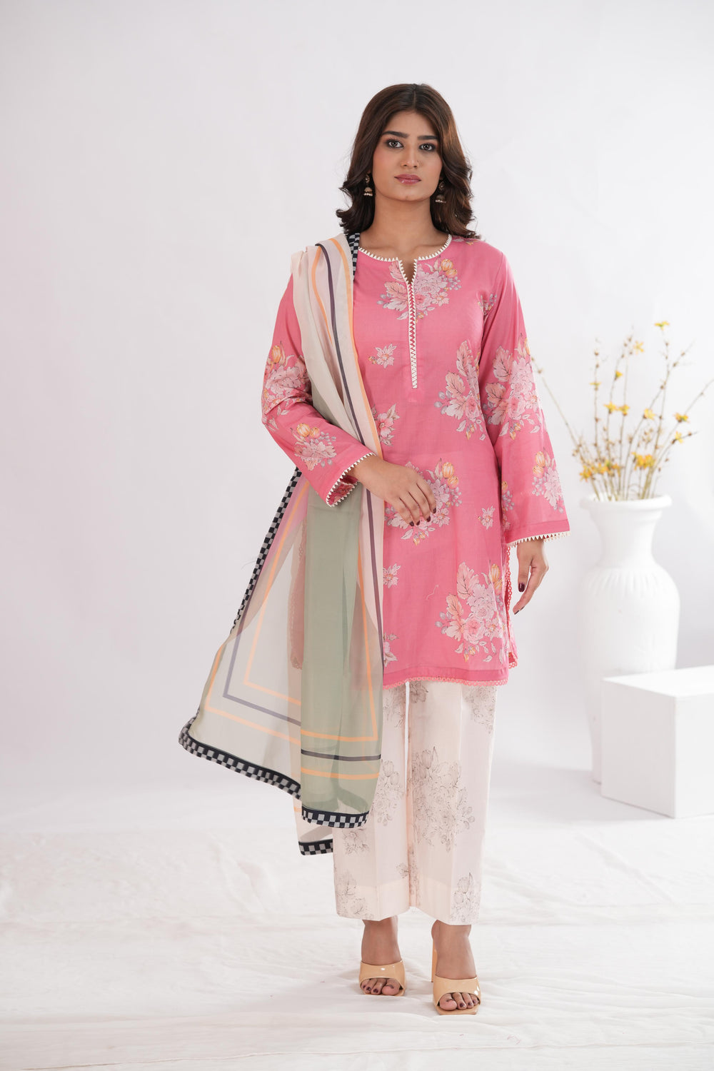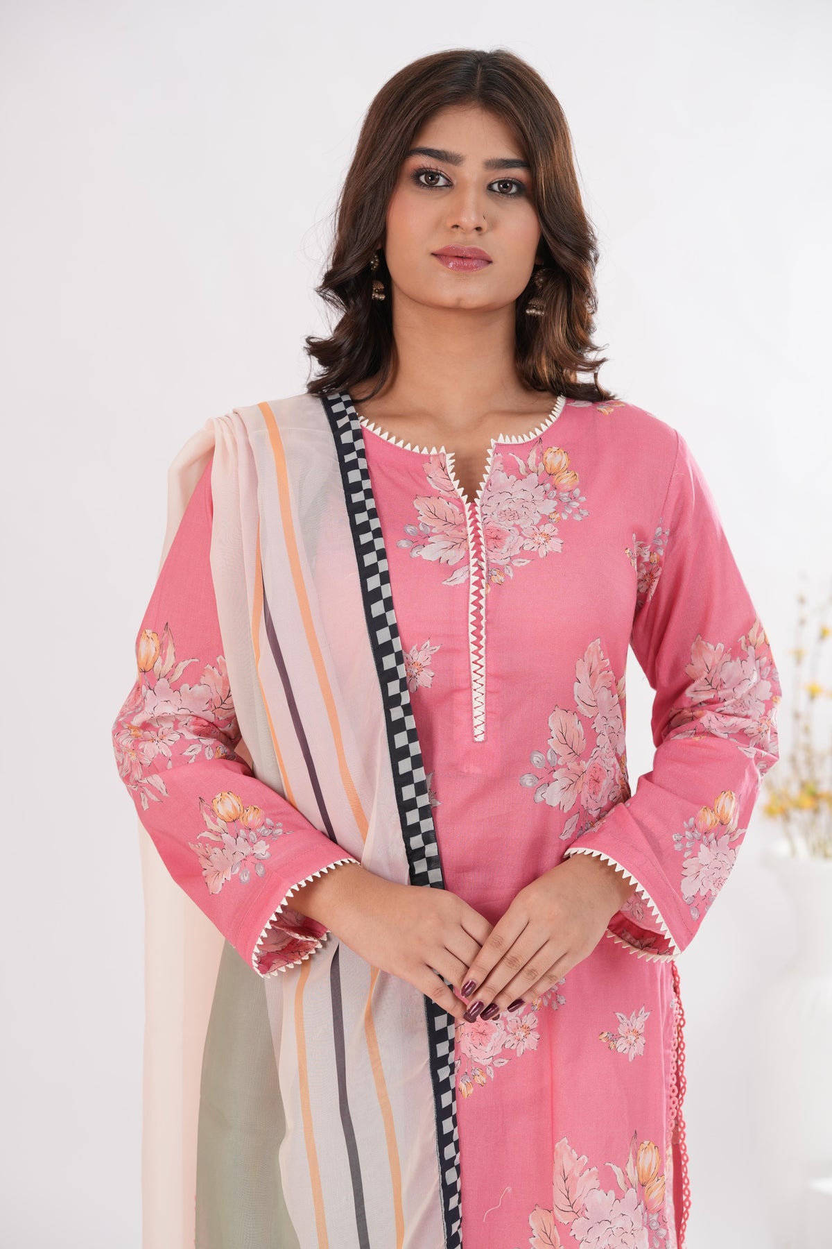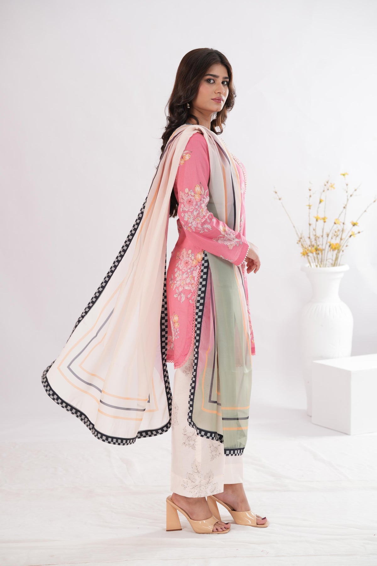 A floral soft rose pink shirt with ivory trousers, paired with a silk dupatta, fresh and feminine.