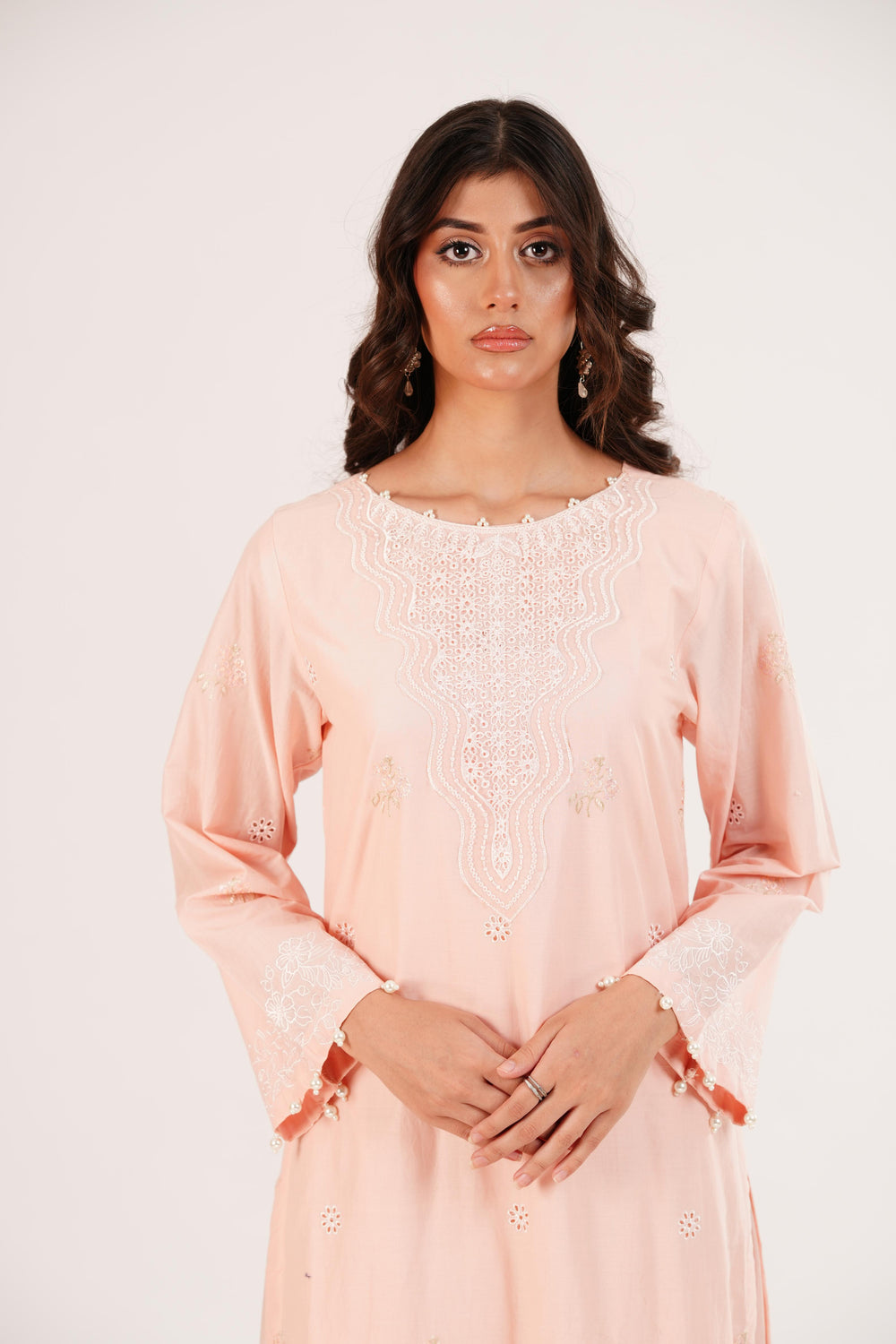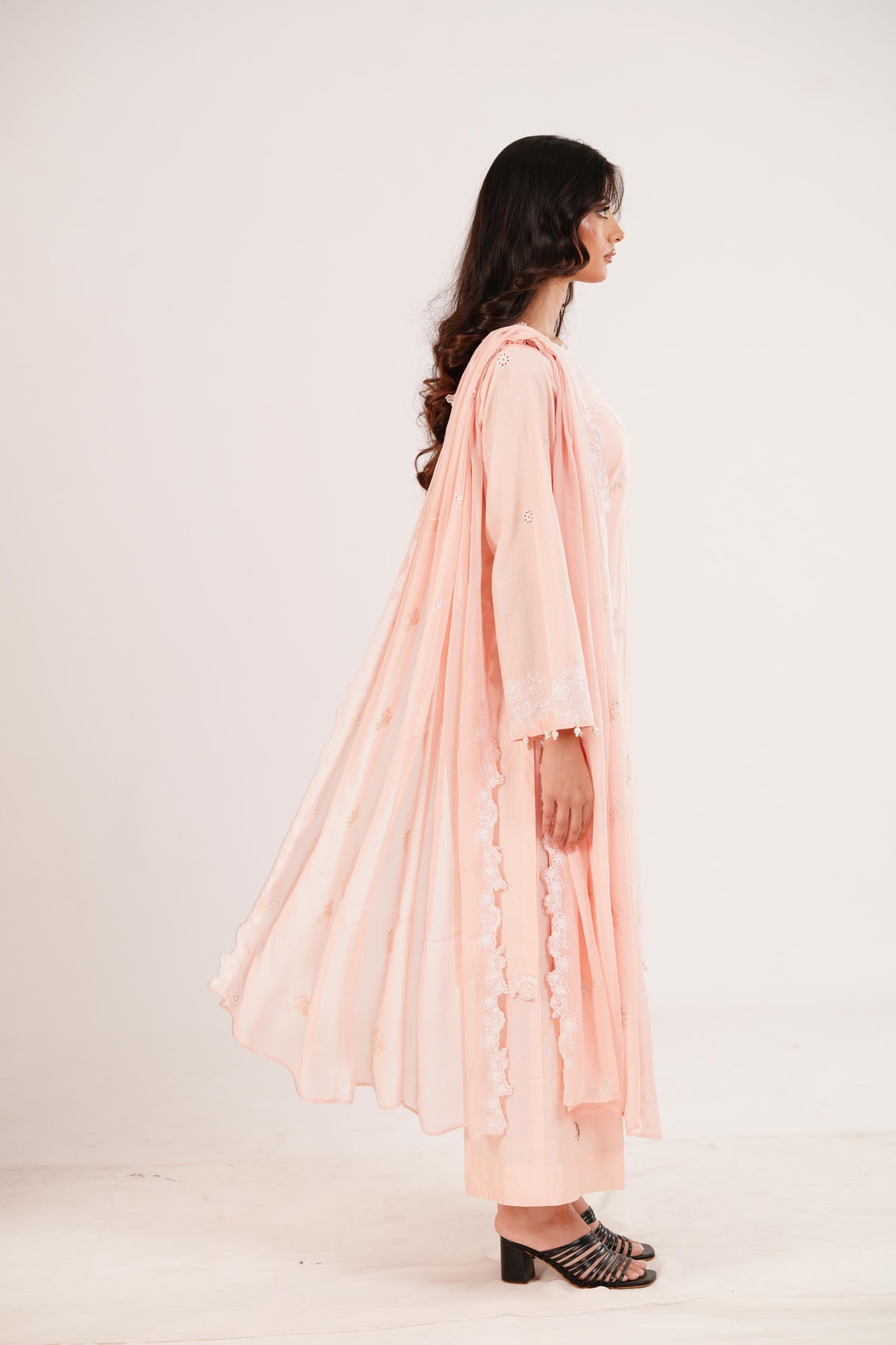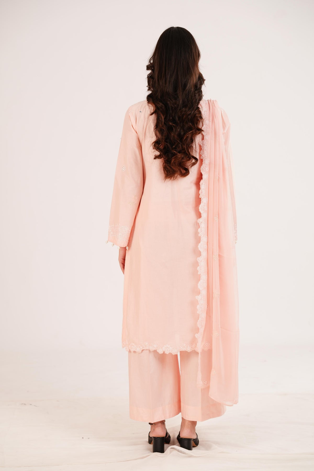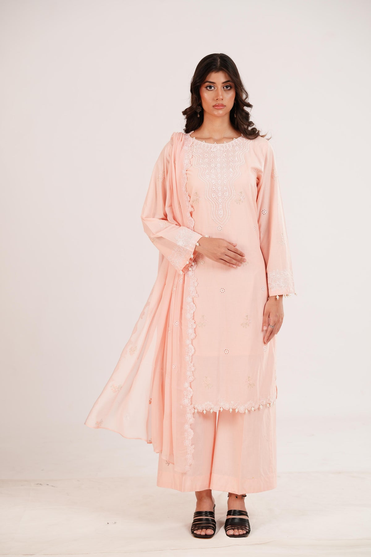 This Pink Blossom 3PC Lawn Embroidered Suit features a finely crafted lawn shirt with detailed embroidery on the front, sleeves, and neckline, complemented by an 80-embroidered patti along the shirt front hem. The cambric dyed trousers offer a comfortable fit, while the chiffon dupatta is adorned with elegant embroidery, completing a sophisticated and cohesive ensemble. Ideal for those seeking refined craftsmanship and stylish comfort.