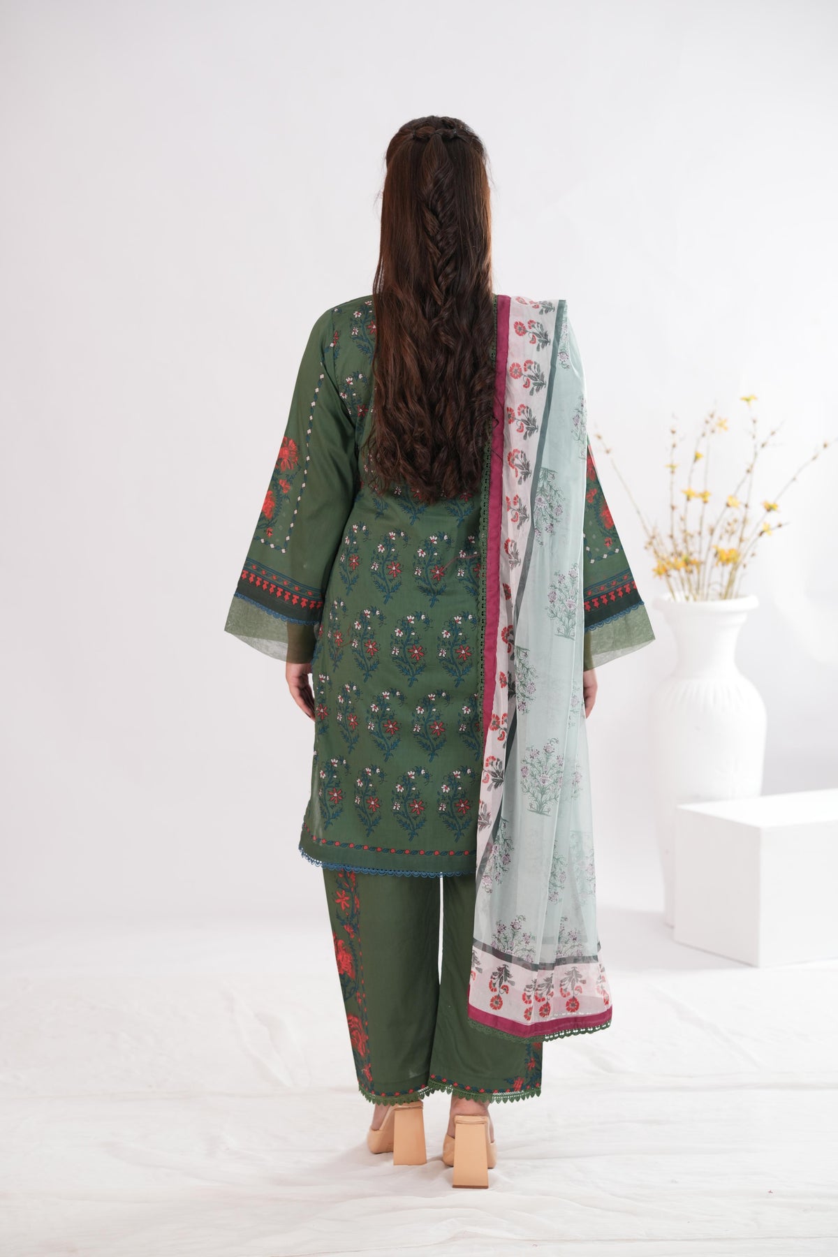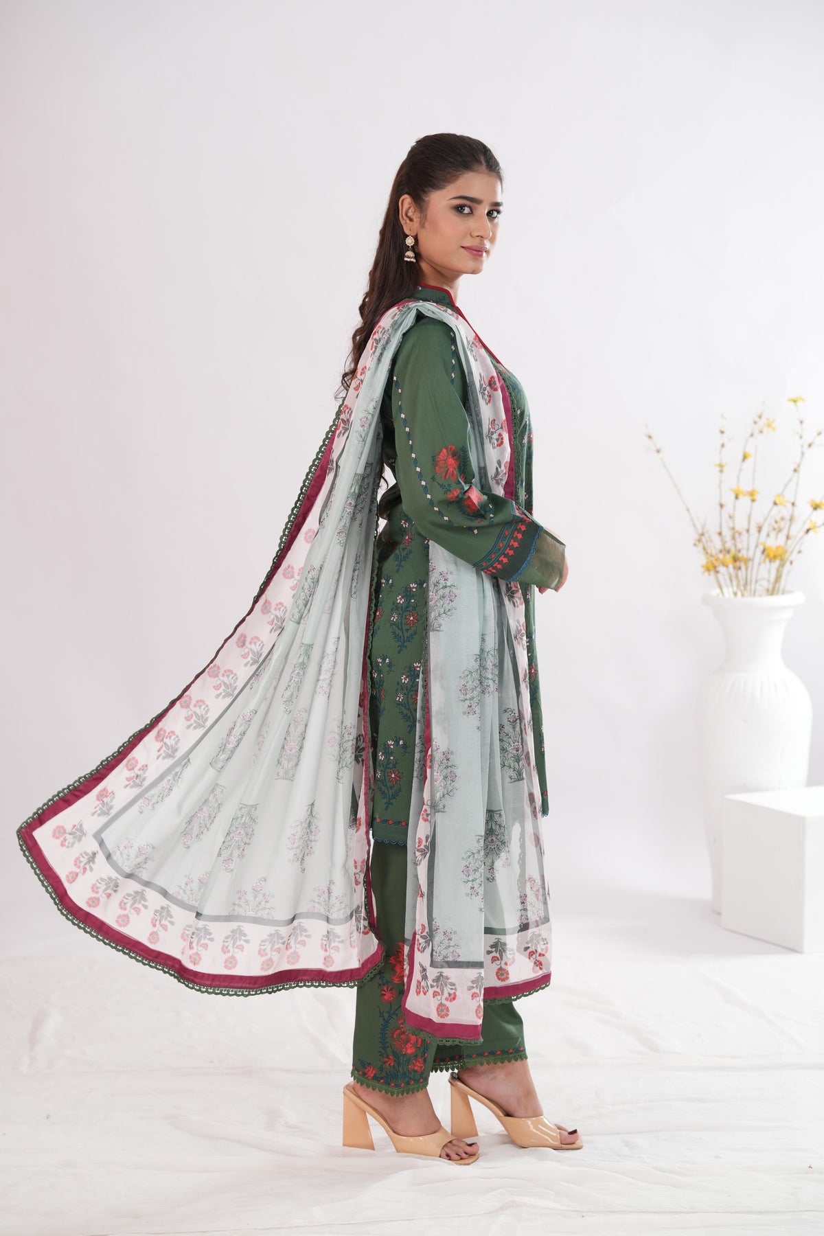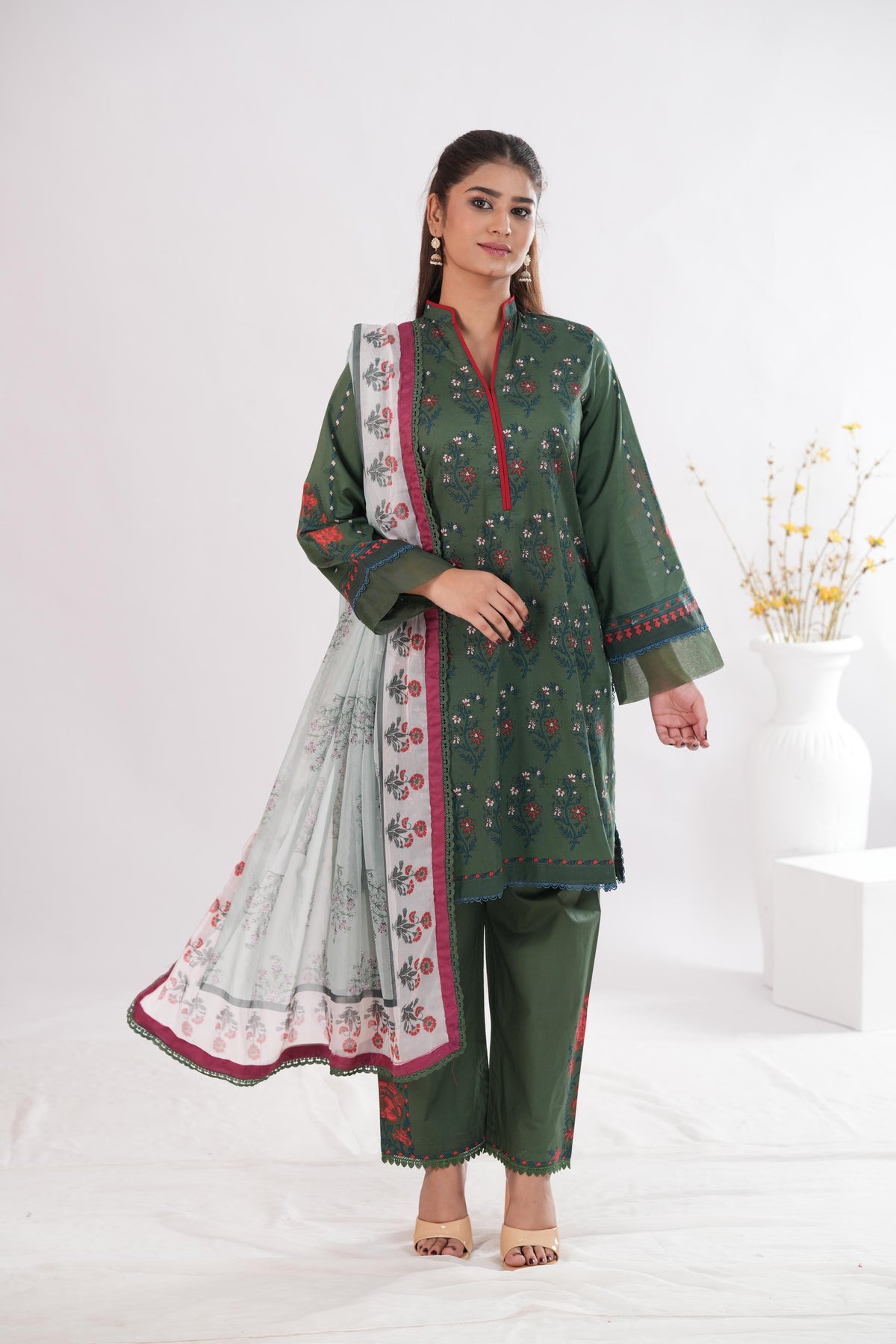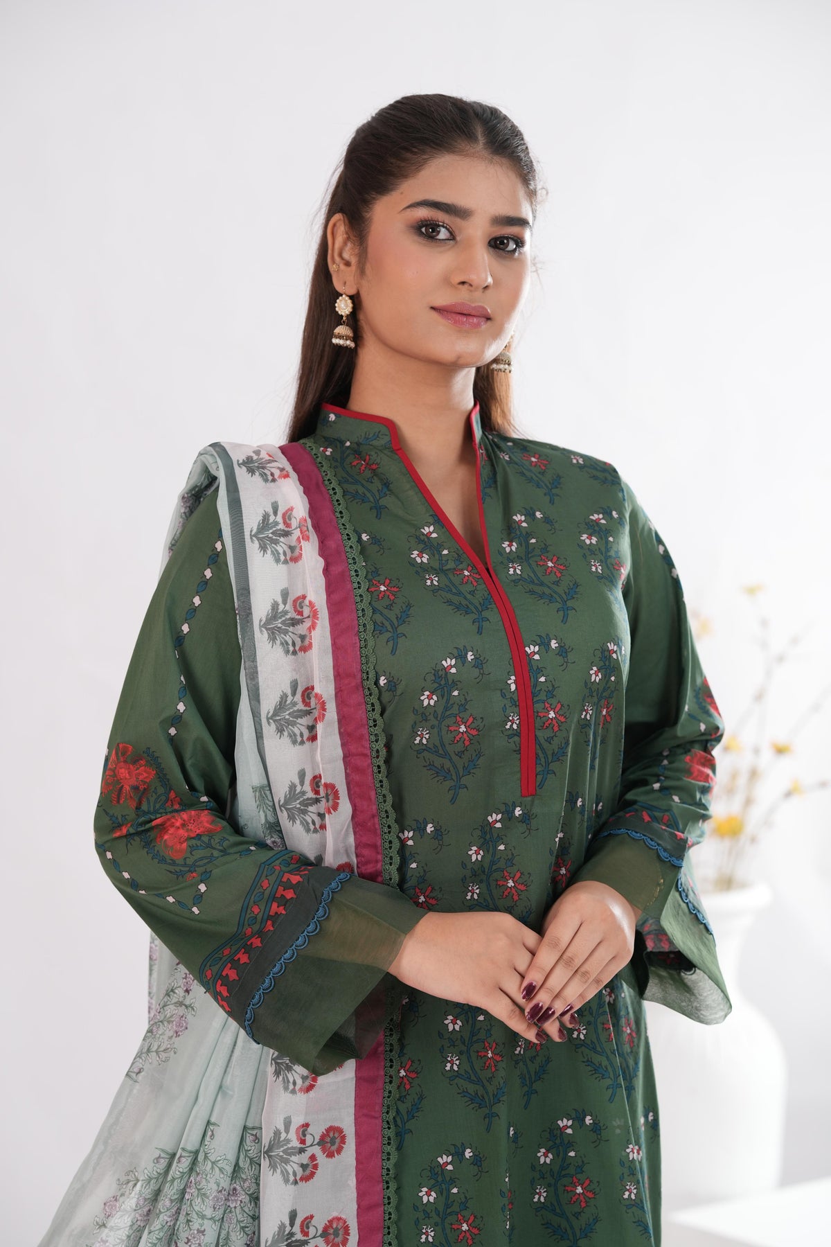 A paisley print shirt in moss green paired with a composed printed trouser, elevated with a graceful silk dupattaÑclassic with a twist.
