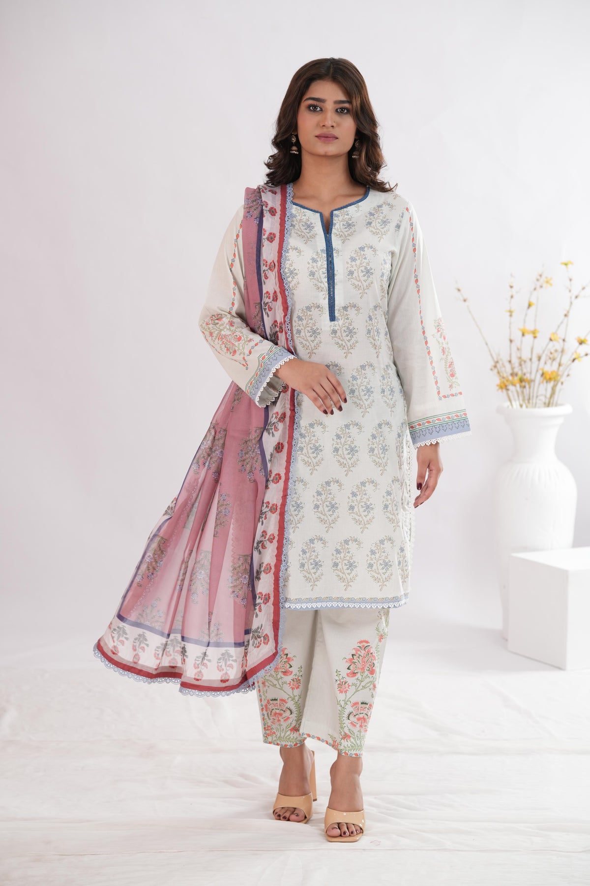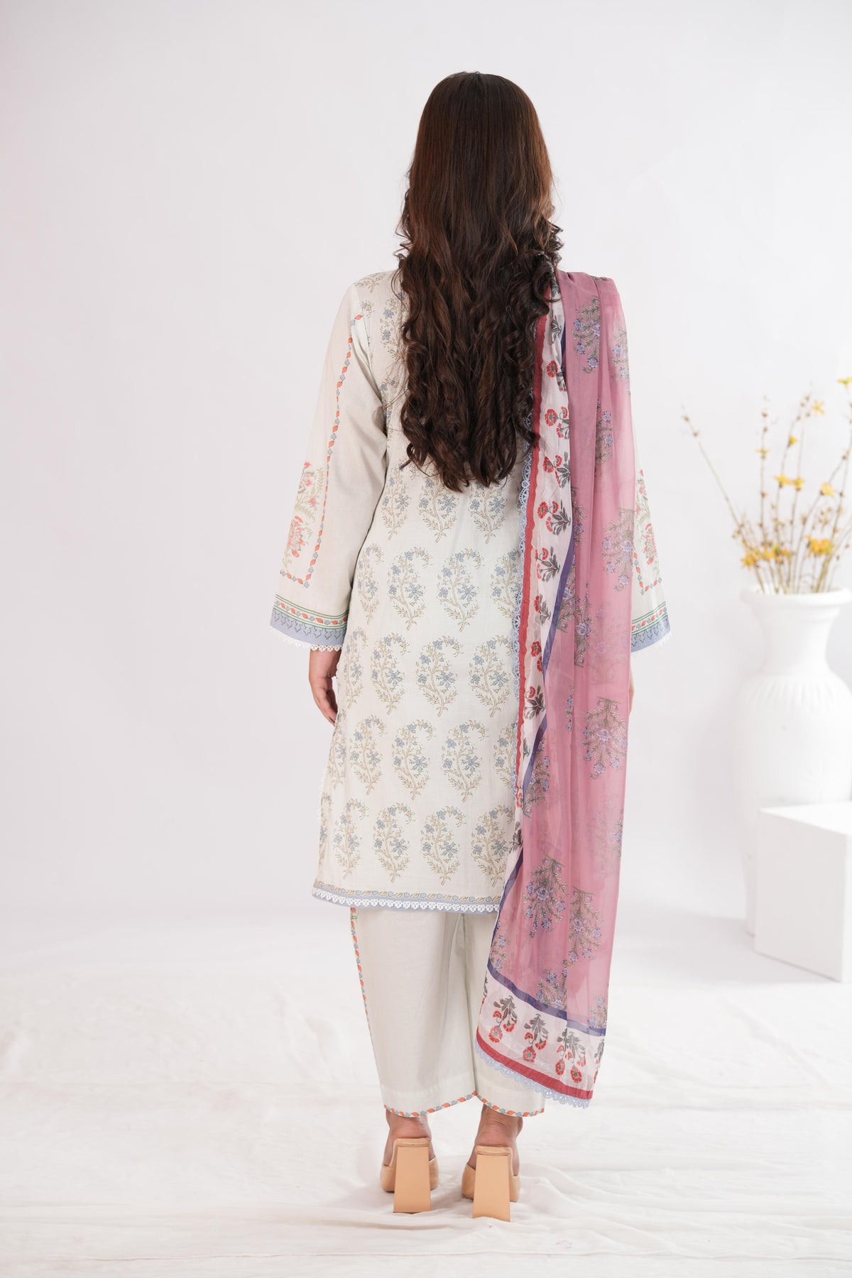A paisley print on silver satin grey, paired with composed trouser and a silk dupattaÑsubtle sheen, timeless ease.