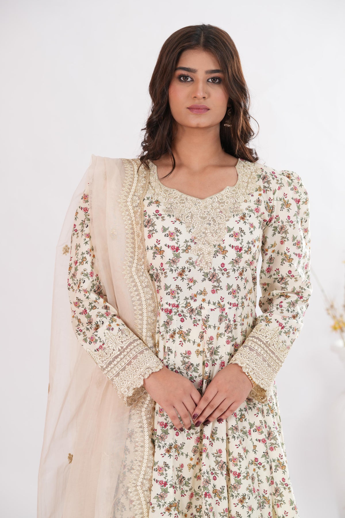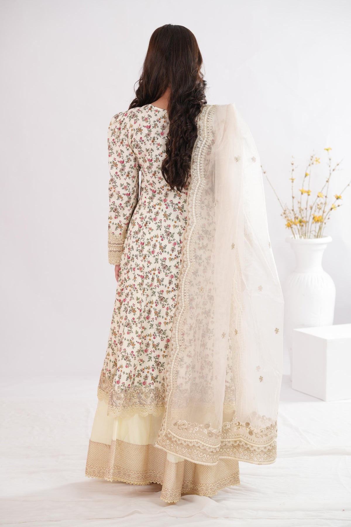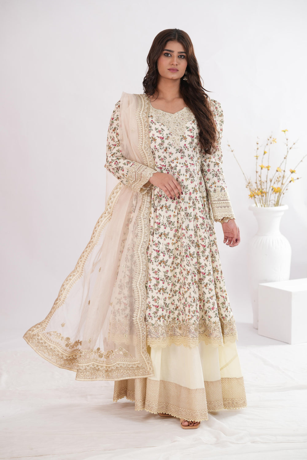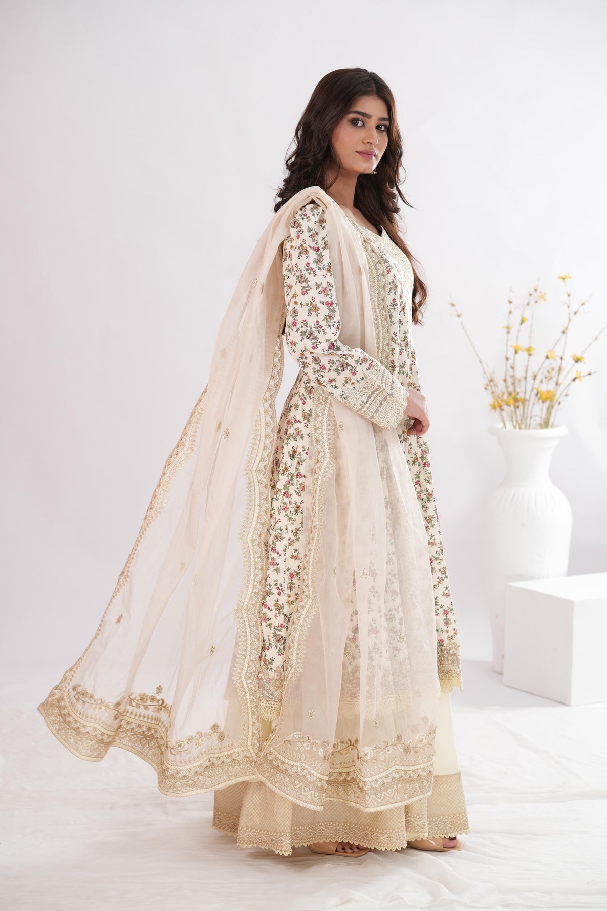 Immortalizing feminine grace, Vinika radiates an effortlessly classic aura. Crafted on sumptuously soft lawn, the off white shirt brims with an abundant scatter of floral motifs. This number comes with 5 embroidered organza patches to accentuate the 4 meter shirt. Paired with a resplendent organza dupatta, this outfit injects your wardrobe with the perfect refresh.