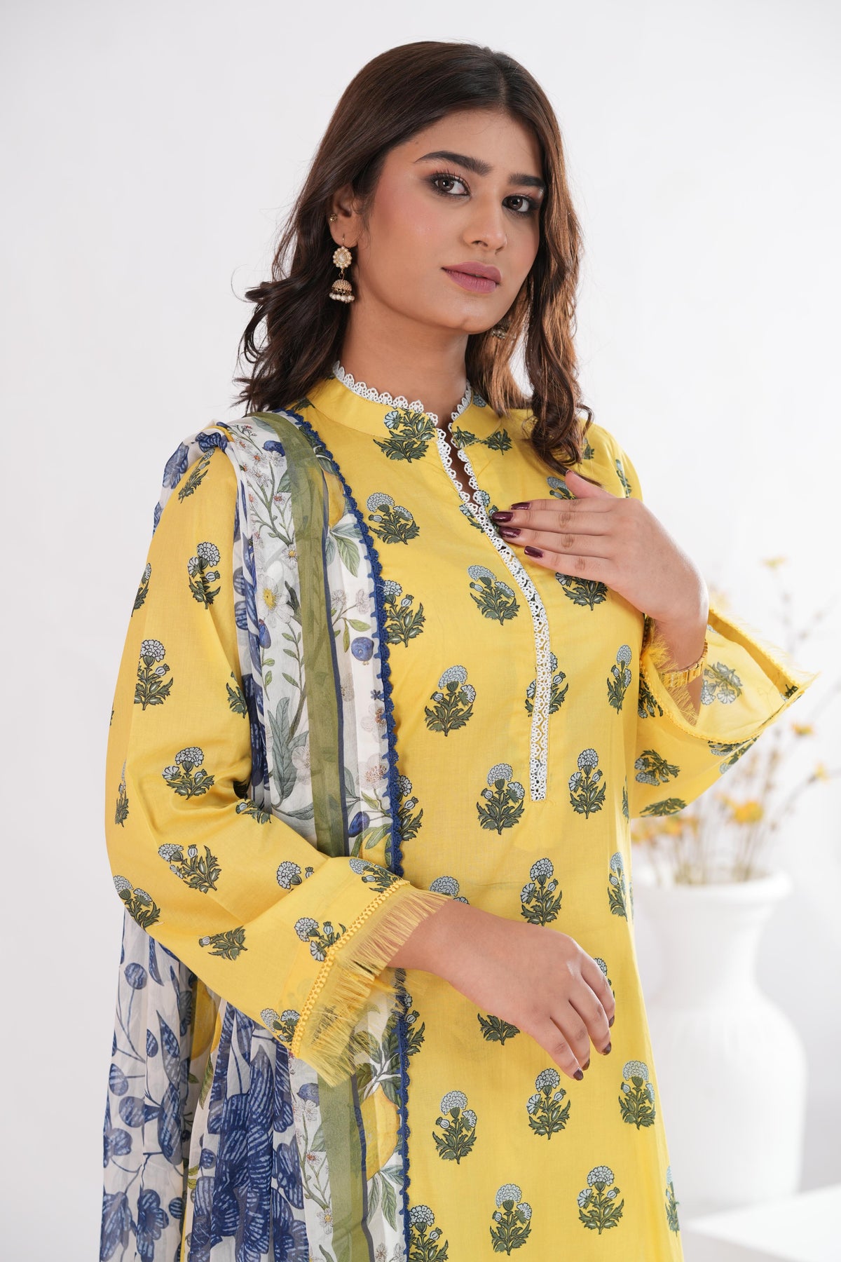 A sunflower yellow shirt with off-white block print inspired trouser, paired with a airy chiffon dupattaÑbright, breezy, and full of charm.