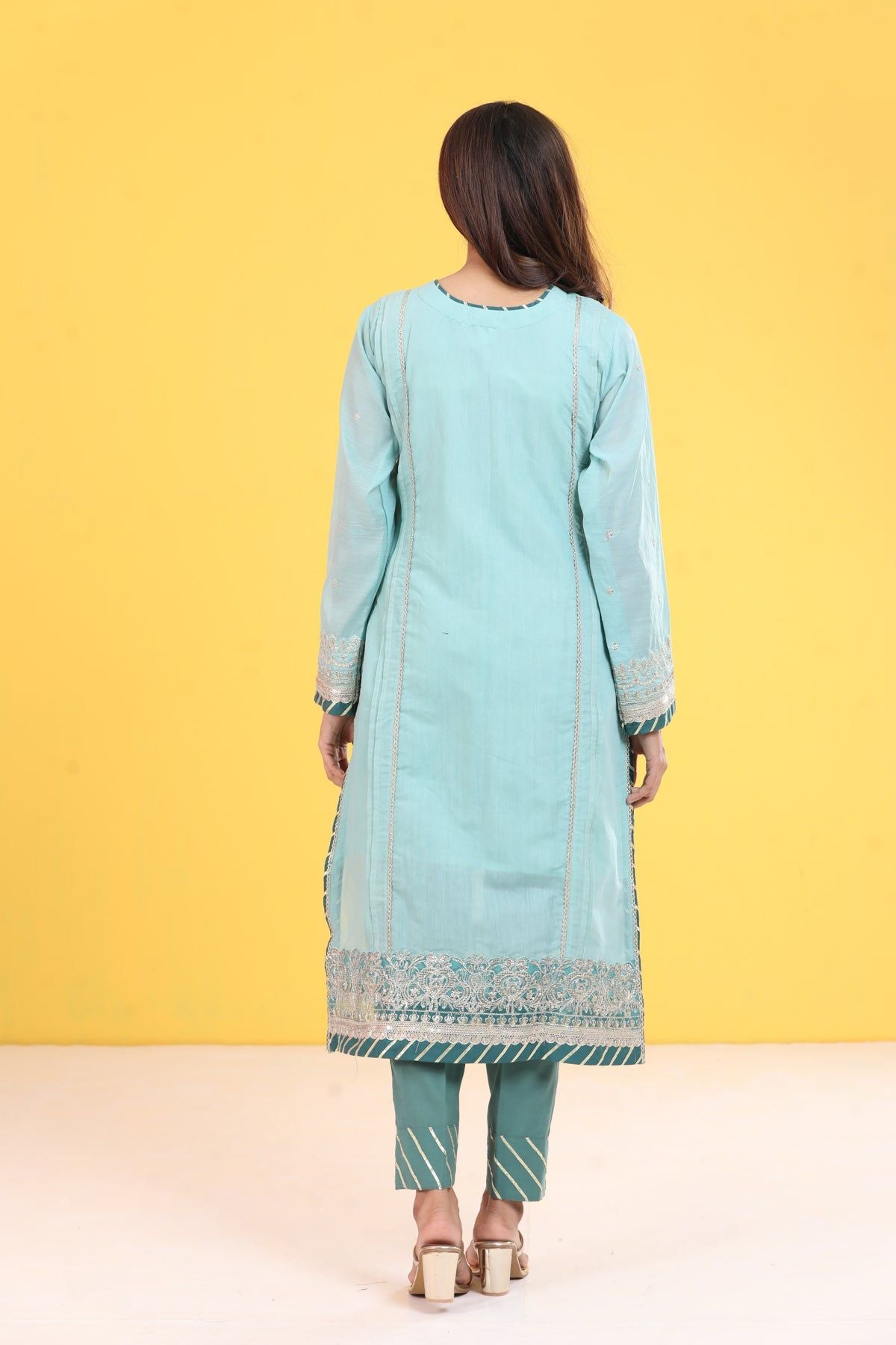 Step into a world of heavenly beauty as Mawra Hocane graces the scene, draped in the luminous 'ZARI SITARA' ensemble, evoking a sense of ethereal wonder. True beauty lies in the weaving of threads! Vibrant and spirited, this mint green shirt will be your instant wardrobe favorite. Endowed with sequins work and white thread embroidery, this is a classy piece crafted from the finest chanderi cotton. Grab this subtle attire and be in sync with your festive vibes.