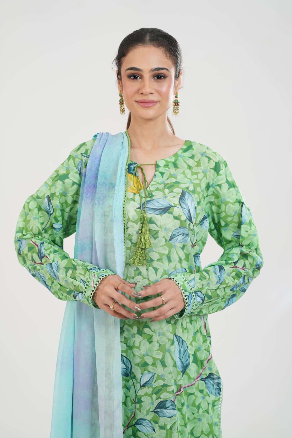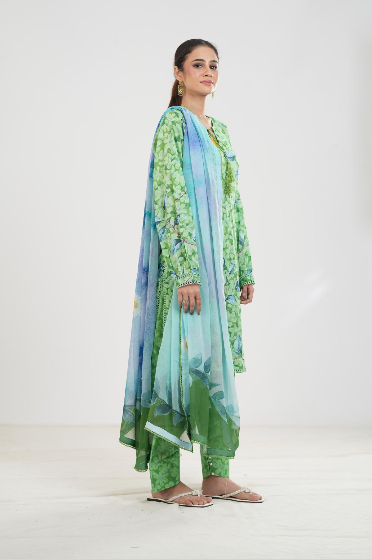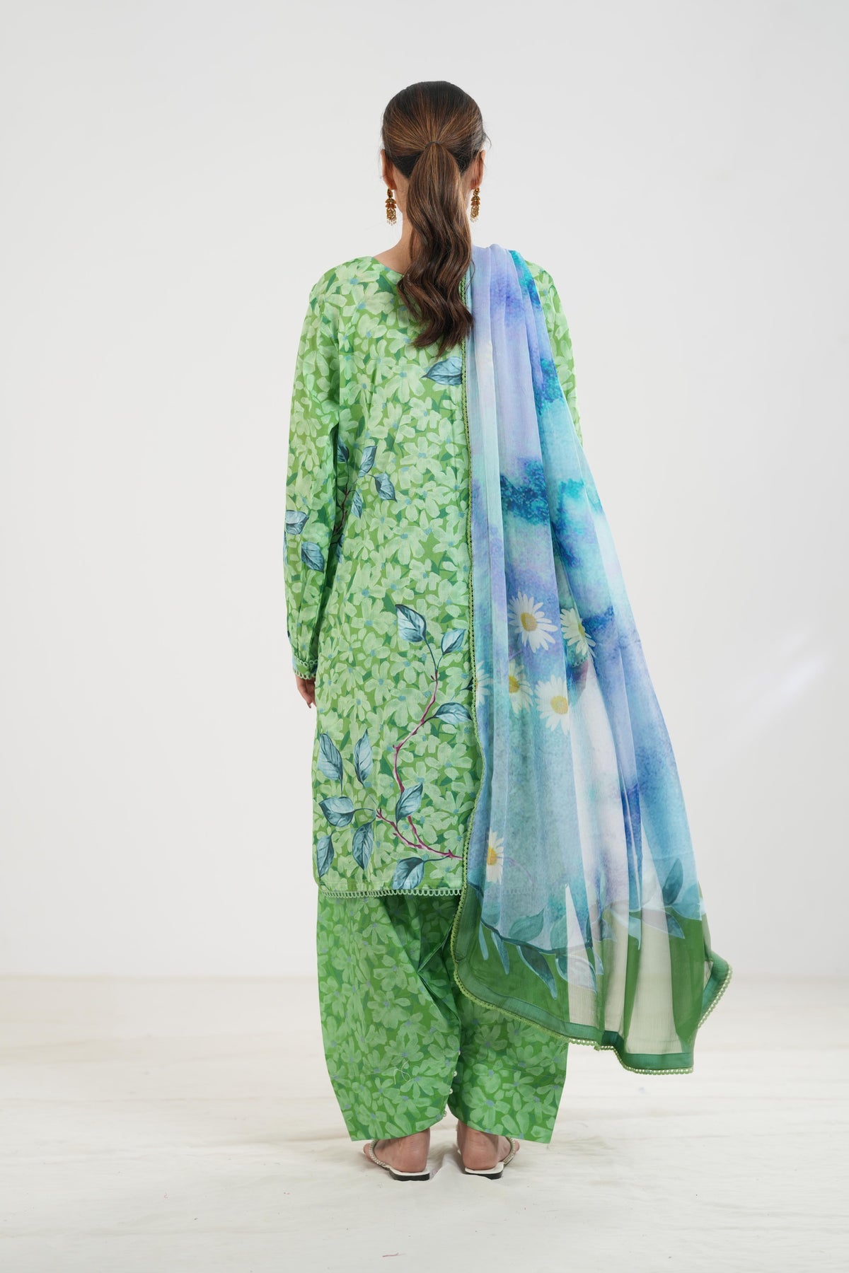 The dupatta presents daisy florals with a watercolor-textured effect in aqua marine tones. The shirt and trouser are printed with daisy meadow inspired motifs on a pear green base.